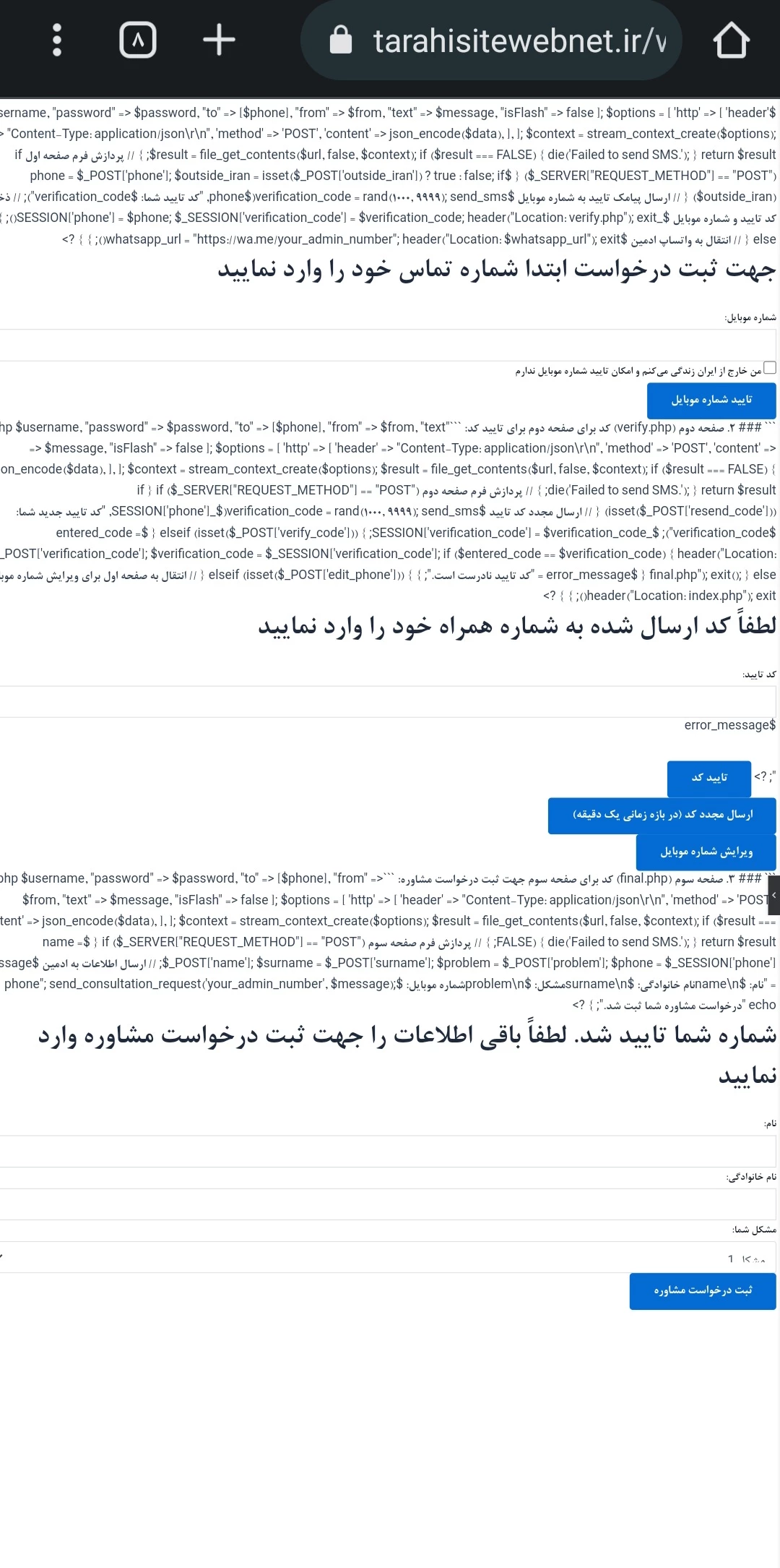 نمونه کارکدنویسی سه فرم که درابتداشماره موبایل متقاضی ودرصورت خارج ازکشوربودن شخص دارای گزینه انتقال به واتساپ میباشدوسپس ارسال کدازطریق APIنرم افزارهای پیامک ودکمه ویرایش شماره ودکمه تایمریک دقیقه ای ارسال مجددکدوپس ازثبت،فرم آخرشماره موبایل ثبت شده رانمایش وسپس ورودنام ونام خانوادگی وانتخاب مشکل متقاضی وسپس ثبت درخواست مشاوره میباشد.