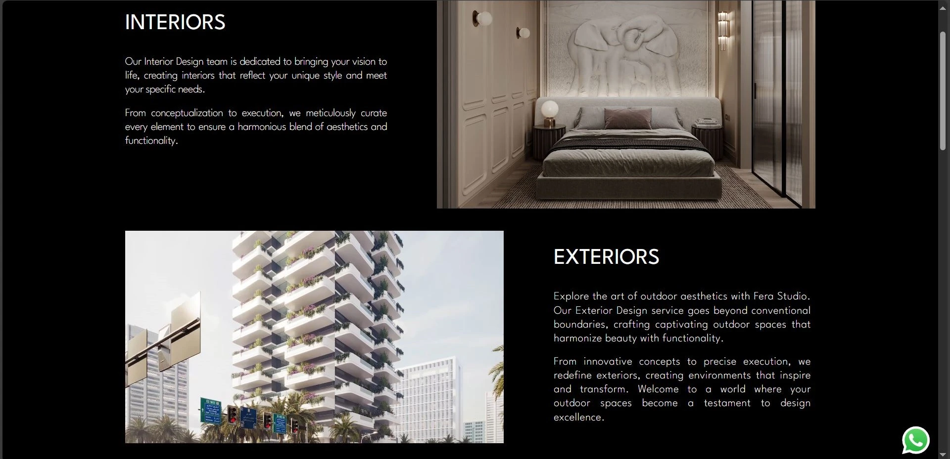 طراحی وبسایت شرکتی fera studio با وردپرس و المنتور کد نویسی در صفحاتی مانند services کاملا پیاده شده از روی طراحی ui سرعت بالا ( به دلیل هاستینگ خارجی ممکن است نیاز به تغییر ای پی باشد )