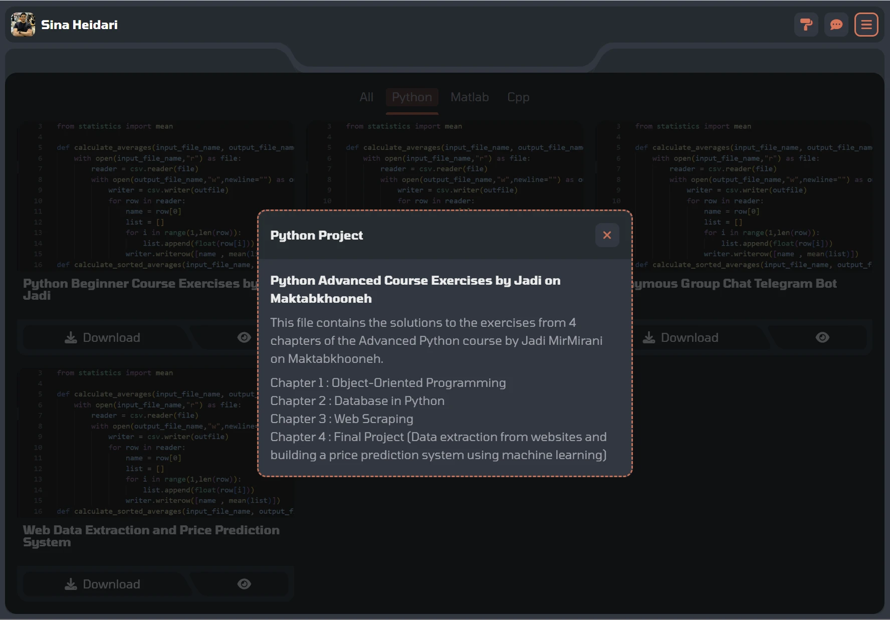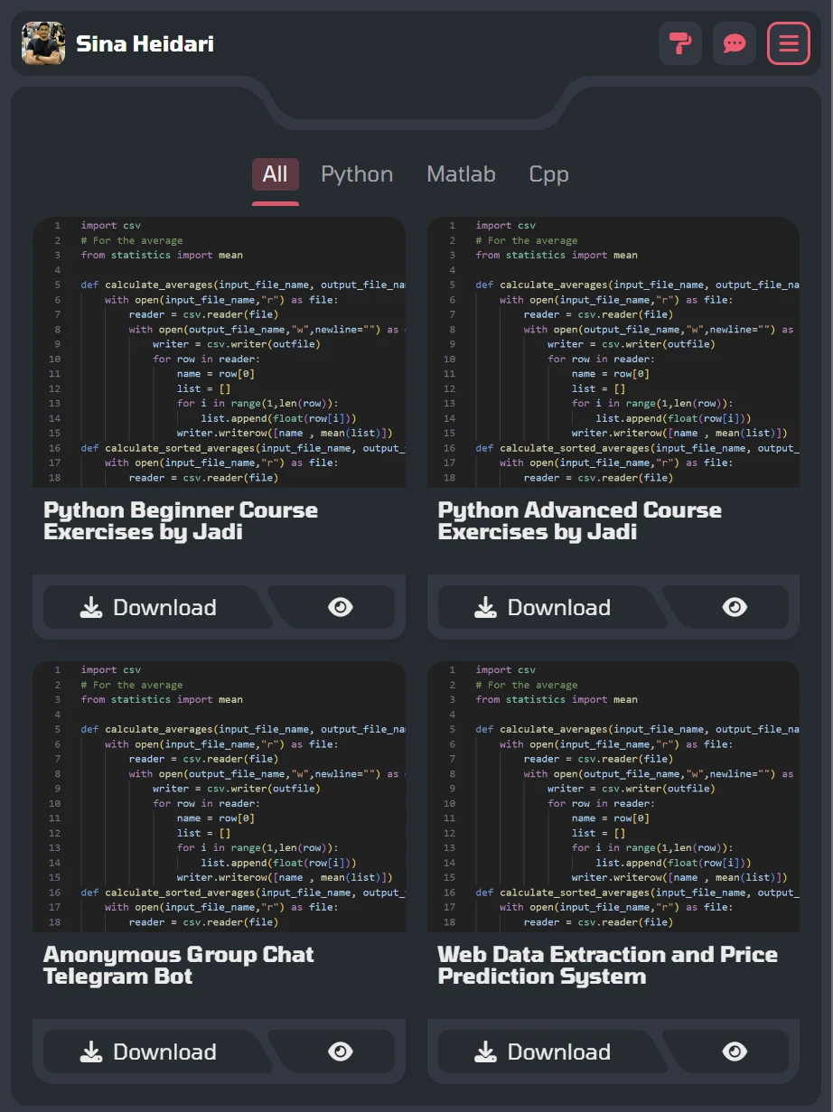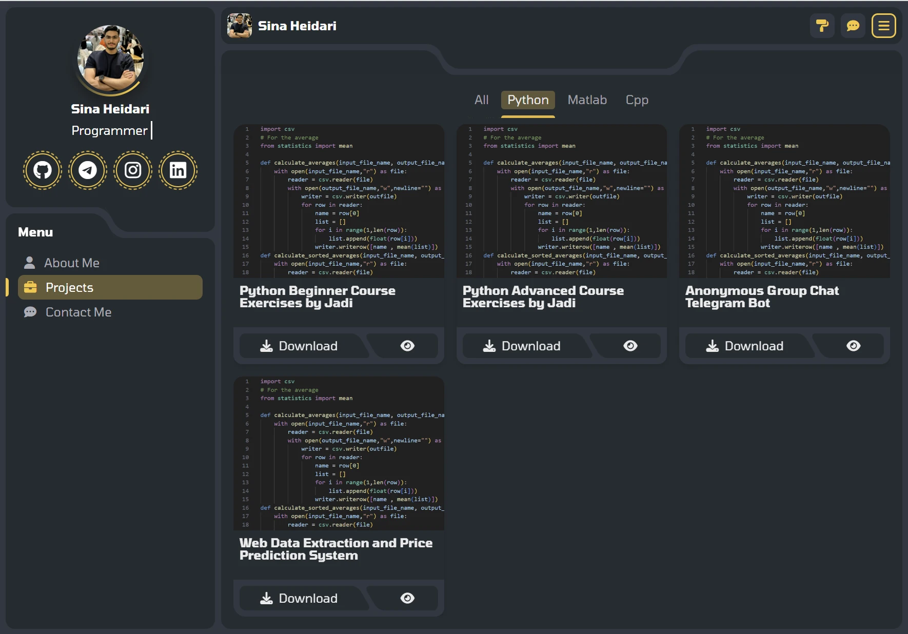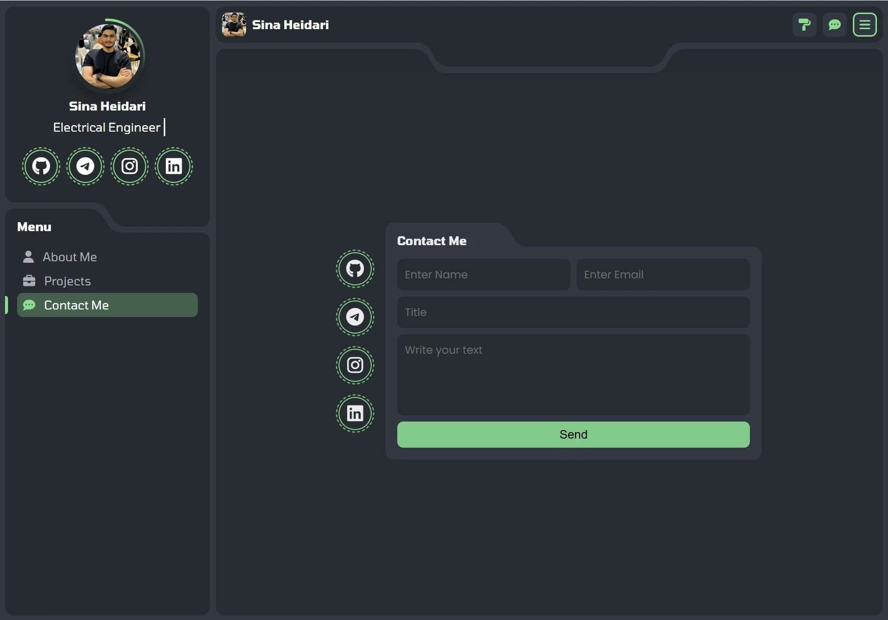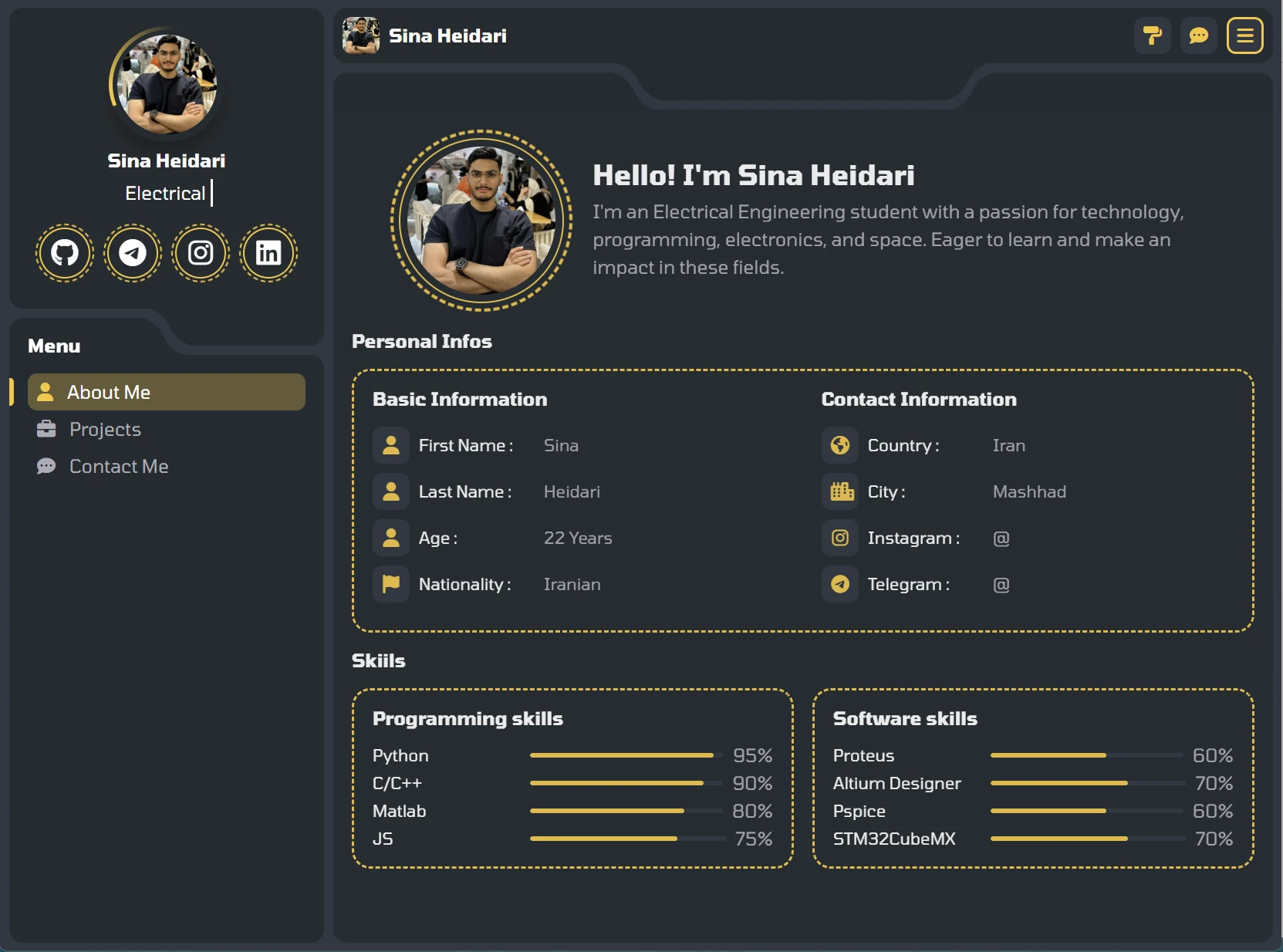 پروژه طراحی یک سایت شخصی . شامل بخش های درباره من ارتباط با من و پروژه ها بعلاوه قابلیت ها ؛ منو ها و انیمیشن های متعدد و پیچیده .