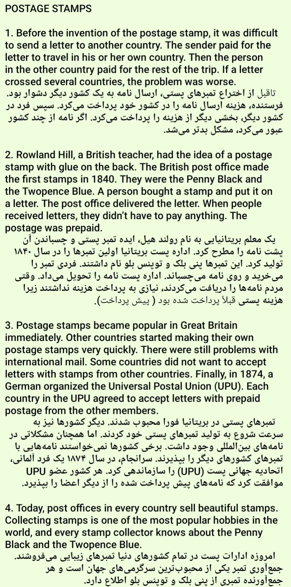 یه متن انگلیسی در مورد تمبرهای پستی، به زبون بسیار ساده و روون و قابل فهم ترجمه شده