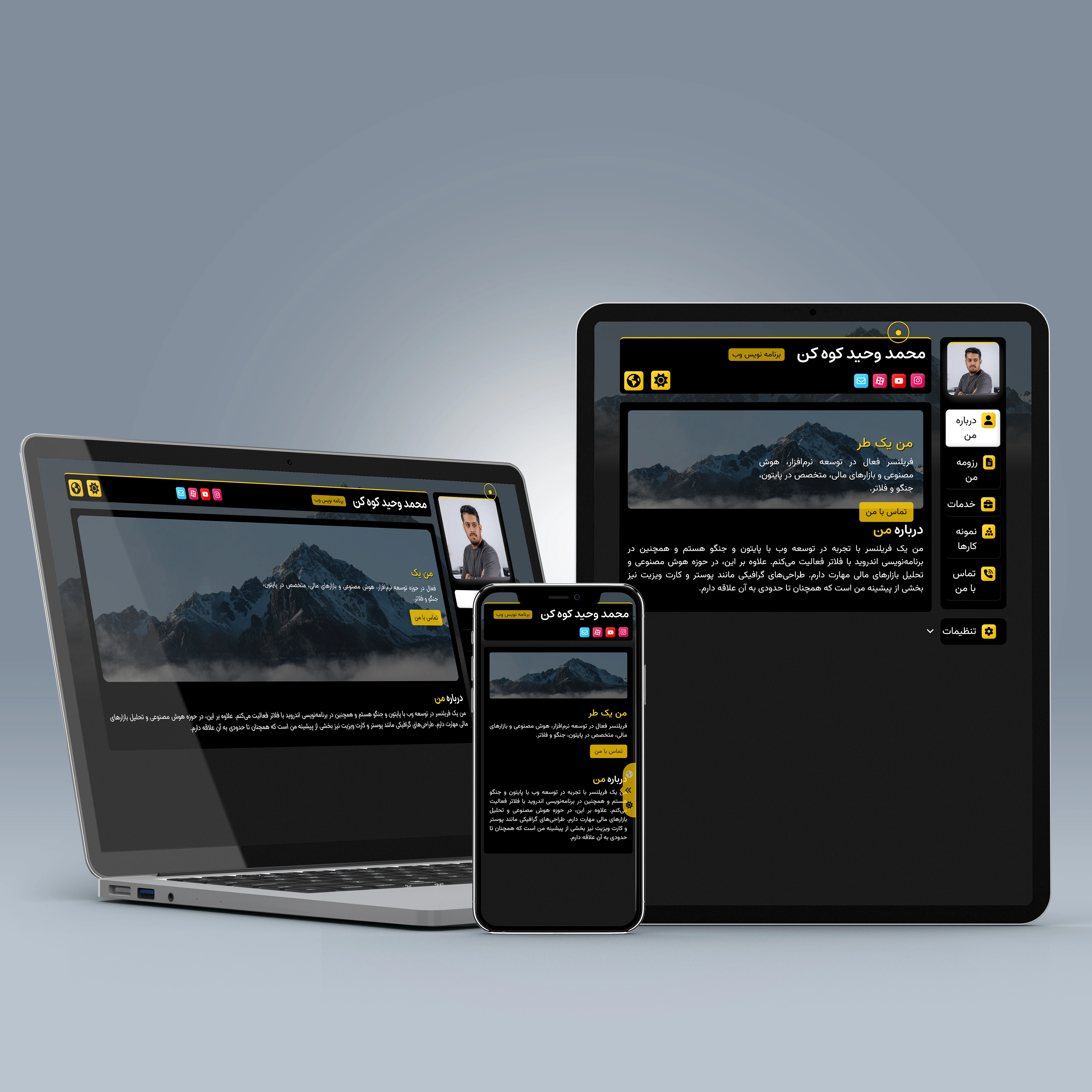 وبسایت شخصی تک صفحه ای برای معرفی مهارت ها، رزومه و ... با قابلیت دو زبانه تم دارک و روشن تغییر فونت و رنگ به طور کامل به وسیله کاربر رعایت اصول سئو و ...