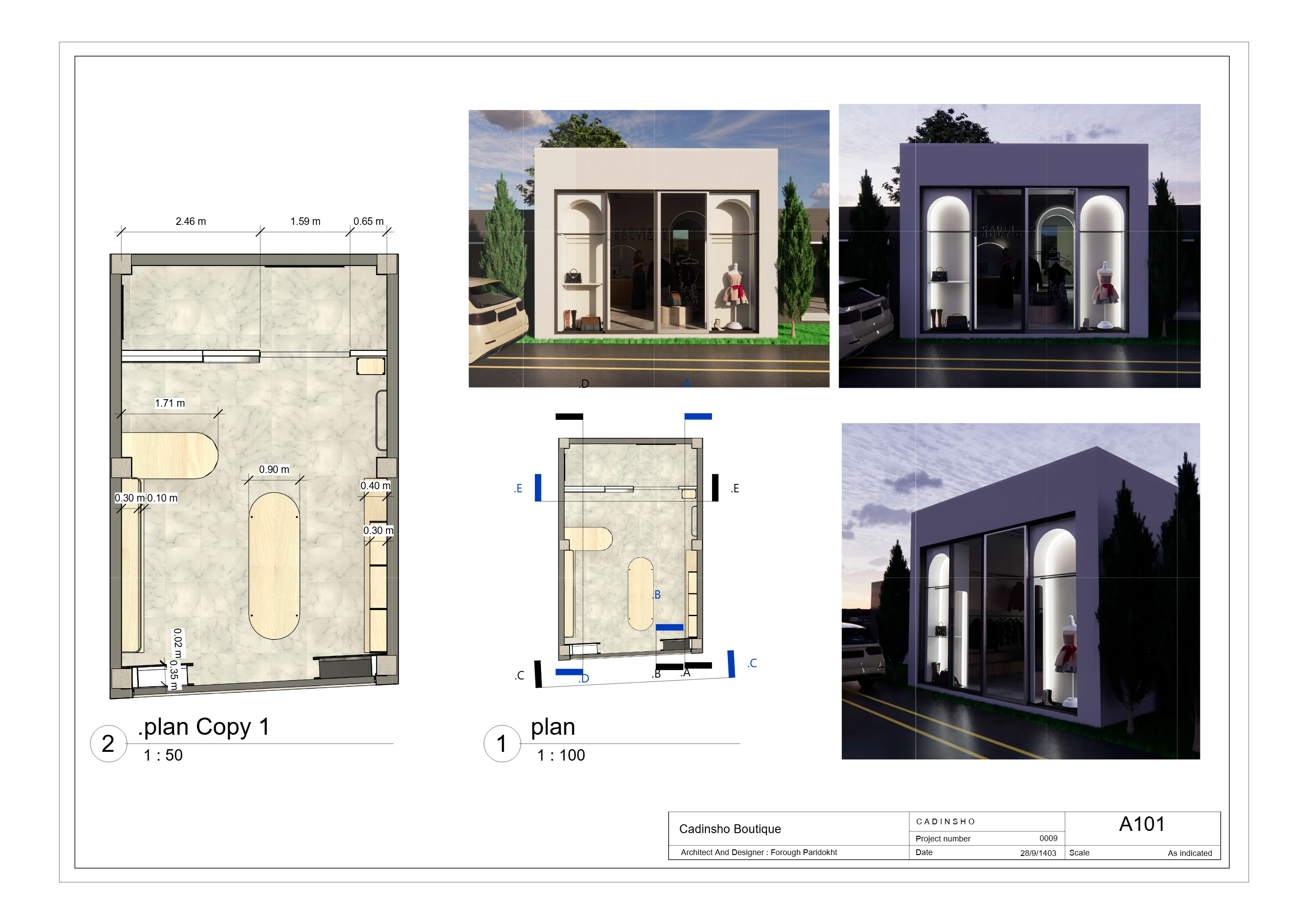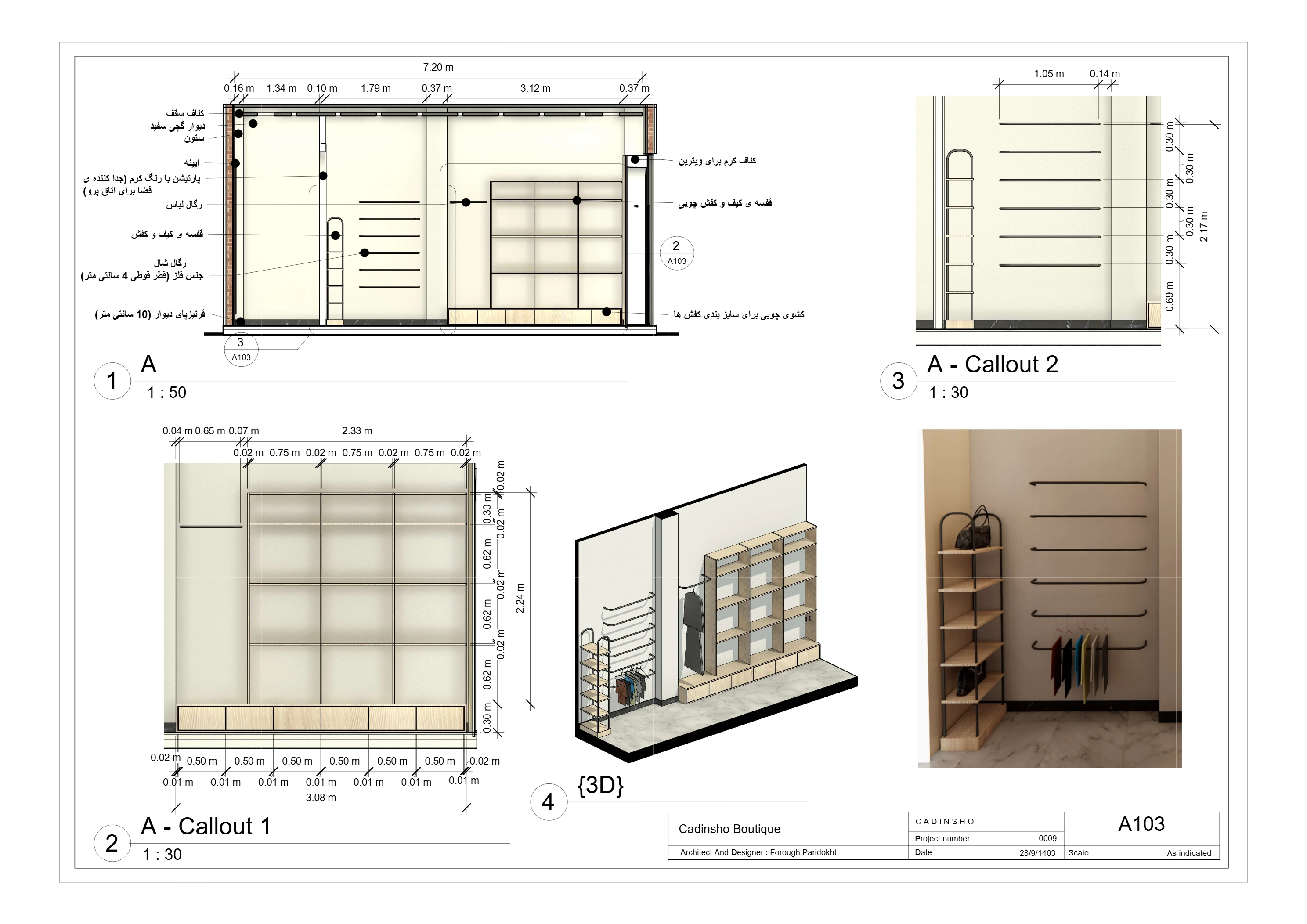 طراحی داخلی بوتیک لباس و کیف با ابعاد و اندازه ی دقیق و جزئیات اجرایی .