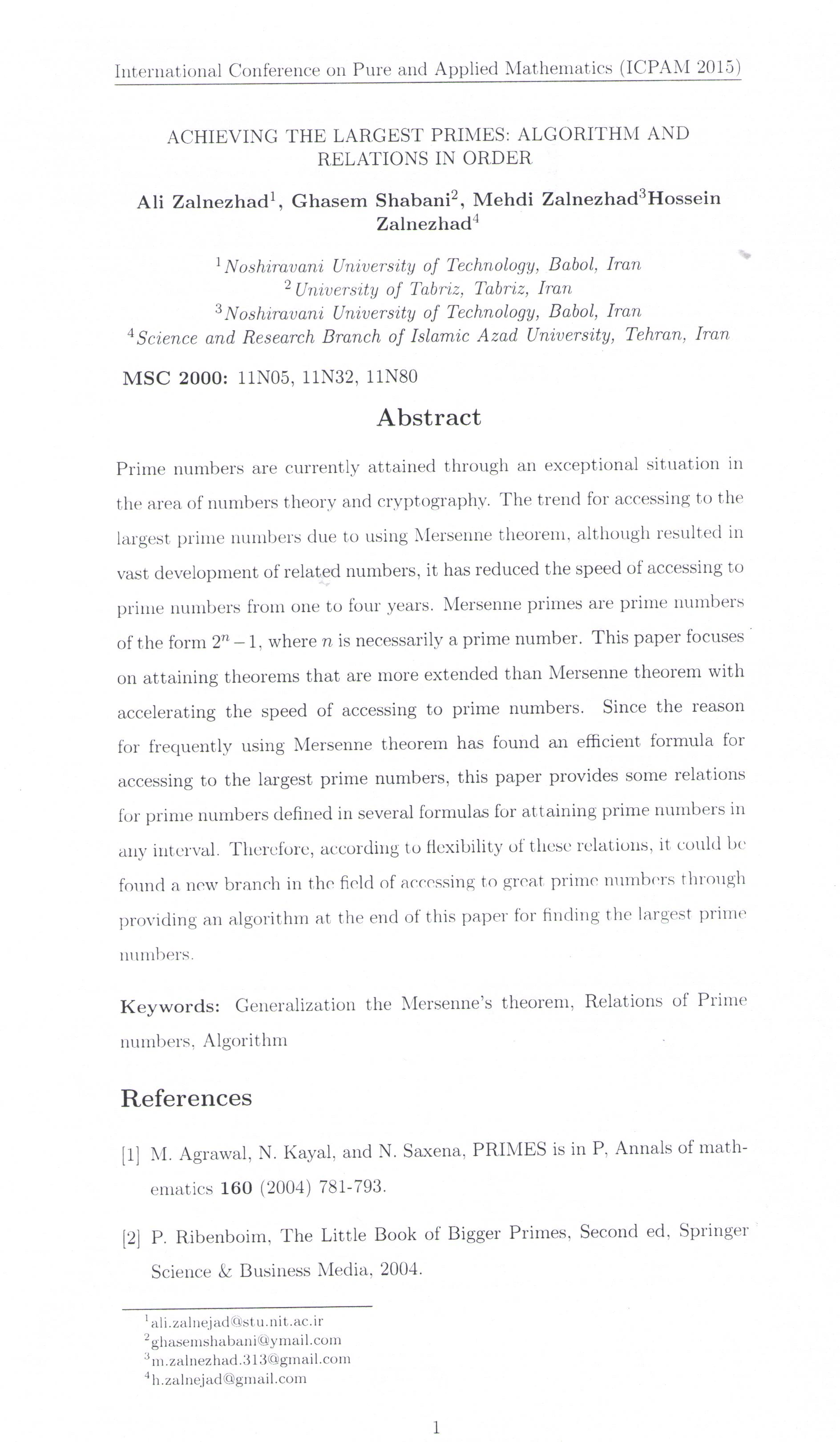 مقاله ارایه شده در کنفرانس بین المللی ICPAM ترکیه ارایه الگوریتمی جدید و ساختار ارتباطی قابل برنامه نویسی برای ساختن PRIME NUMBER