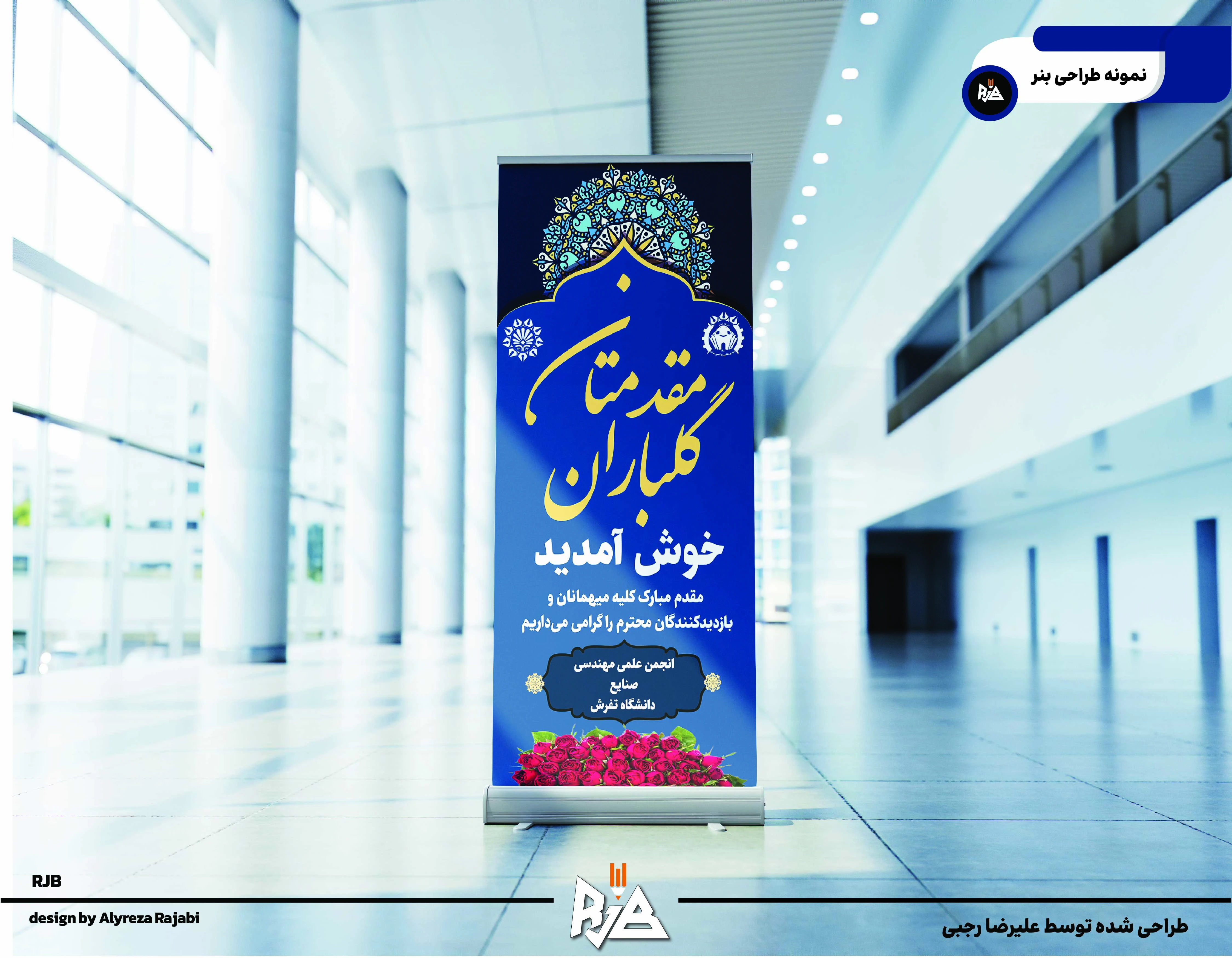 ین بنر استند با طراحی چشمنواز و الهام گرفته از المانهای سنتی و اسلامی، به منظور خوشآمدگویی به مهمانان و بازدیدکنندگان یک رویداد دانشگاهی طراحی شده است. استفاده از ترکیب رنگهای آبی و طلایی، حس اصالت و وقار را منتقل میکند، در حالی که تایپوگرافی زیبا و المانهای گرافیکی مانند کاشیکاری سنتی در بخش بالایی، جذابیت بصری خاصی به آن بخشیده است این طراحی مناسب همایشها، سمینارها و مراسم رسمی دانشگاهی بوده و به شکلی حرفهای حس استقبال گرم وصمیمی را به مهمانان منتقل می کند