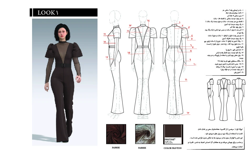 در طراحی این لباس علاوه بر استفاده از خلاقیت به جزییات در باره اجرای کار توجه شده و اطلاعات تکنیکال لباس هم در نظر گرفته شده .