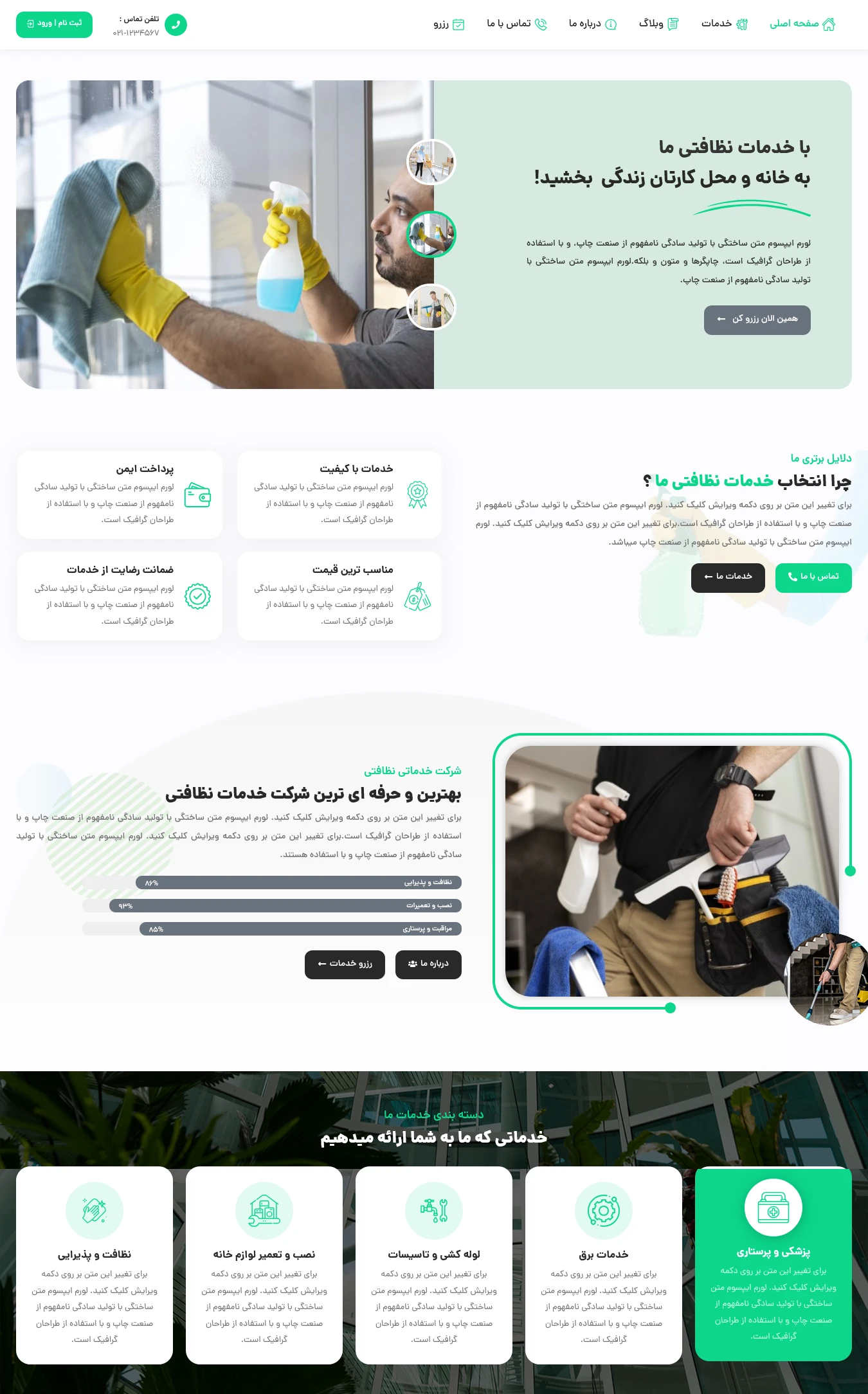 نمونه سایت (وردپرسی)شرکت خدمات نظافت + قابلیت رزرو نوبت، این وب سایت جذاب و زیبا و قدرتمند برای تمامی عزیزانی که در حوزه شرکت نظافتی و خدماتی فعالیت دارند مناسب می باشد. این وب سایت علاوه بر جذابیت و زیبایی ظاهری، در عین حال امکانات قدرتمندی را نیز همچون: معرفی و نمایش خدمات با قابلیت رزرو نوبت آنلاین، نمایش اعضای تیم، نمایش نظرات مشتریان، نمایش و انتشار مقالات و آموزشات و… به شما ارائه میدهد.