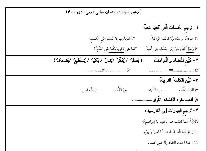 نمونه تایپ عربی نمونه تایپ سوالات امتحانی