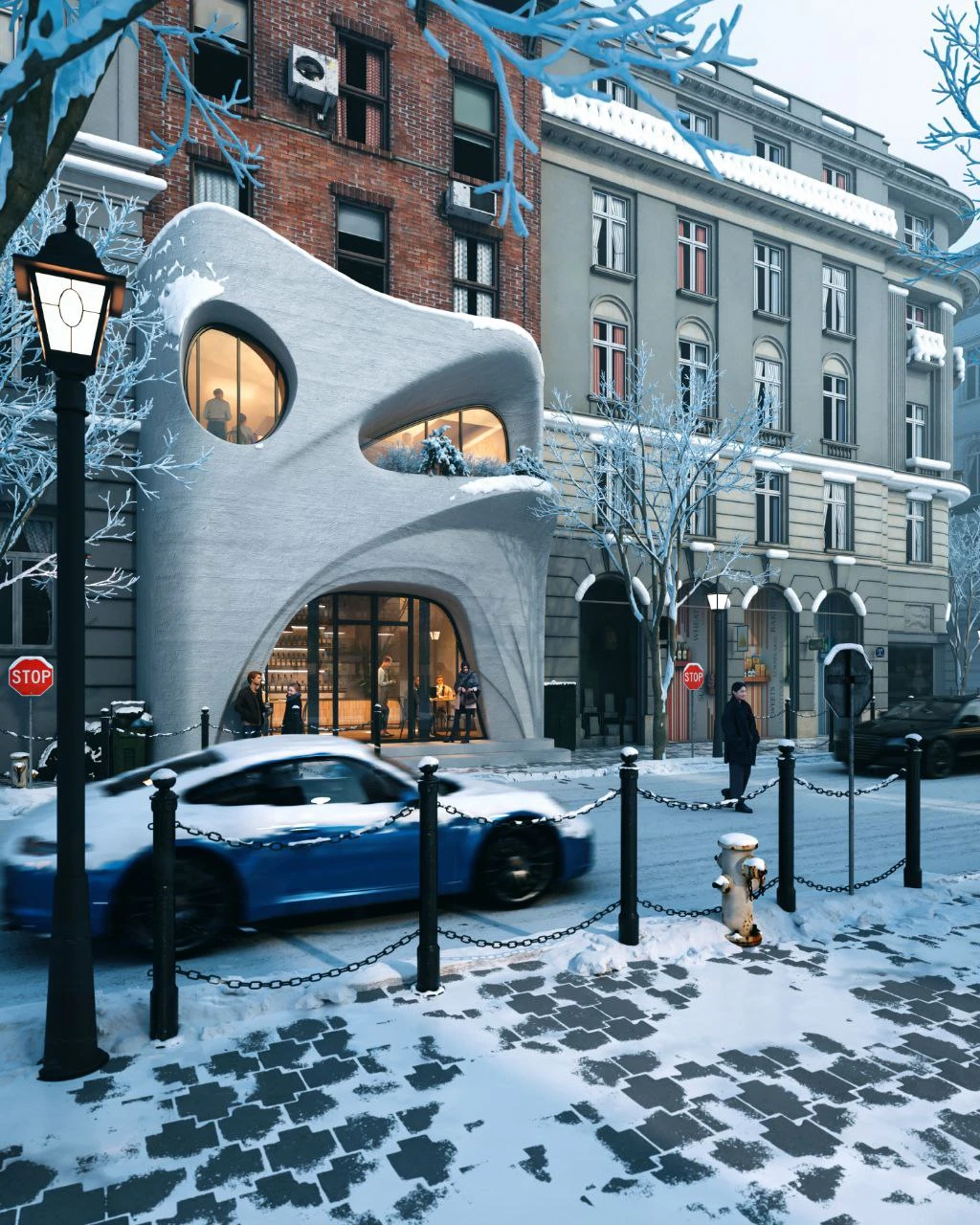 این طراحی نمایی مدرن و ارگانیک دارد که با فرمهای نرم و سیال، تضادی چشمگیر با ساختمانهای کلاسیک اطراف خود ایجاد کرده است. استفاده از منحنیهای روان و حجم یکپارچه، سبک معماری پارامتریک را تداعی میکند که با الهام از فرمهای طبیعی، ساختاری منحصربهفرد و پویا خلق کرده است. متریال بتن سفید و پنجرههای بزرگ، حس آیندهنگرانهای به فضا بخشیده و ارتباط بصری میان داخل و خارج ساختمان را تقویت کرده است. این طراحی نهتنها بهعنوان یک عنصر شاخص در بافت شهری عمل میکند، بلکه حس پویایی و خلاقیت را در محیط پیرامون خود افزایش میدهد.