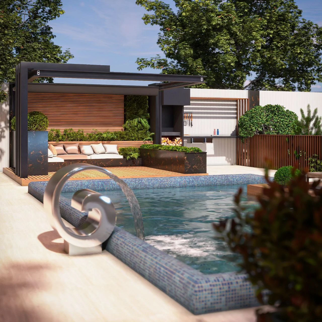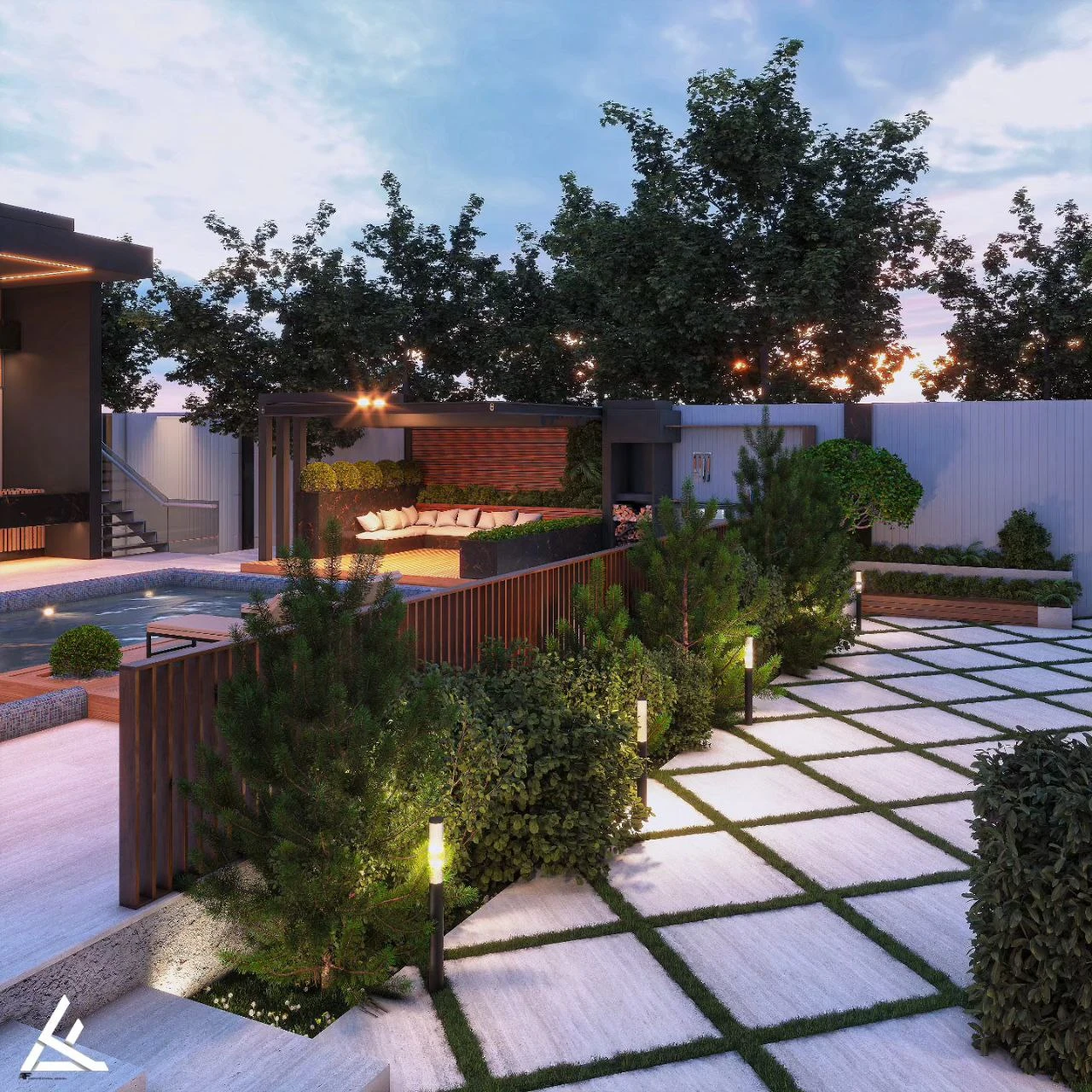 این ویلا با استفاده از سبک مدرن مینیمال طراحی شده است که در آن ترکیب چوب، شیشه و فلز بهخوبی به چشم میخورد. فرمهای خطی و حجمهای ساده اما قدرتمند، حس پویایی و استحکام را به نما القا میکنند. استفاده از متریالهای گرم مانند چوب در کنار فلز مشکی و نورپردازی ظریف سقفی، جلوهای لوکس و معاصر به بنا داده است. طراحی فضای باز با استخر و تراسهای نیمهپوشیده، ارتباط قوی بین فضای داخلی و بیرونی را برقرار کرده و تجربهای جذاب از زندگی مدرن را به نمایش میگذارد.