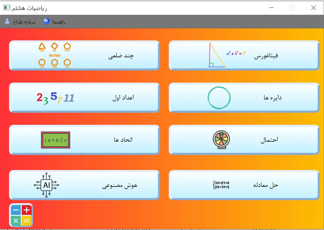 این برنامه توسط پایتون و PyQt نوشته شده. و تمام فصل های ریاضی هشتم را در بر می گیرد