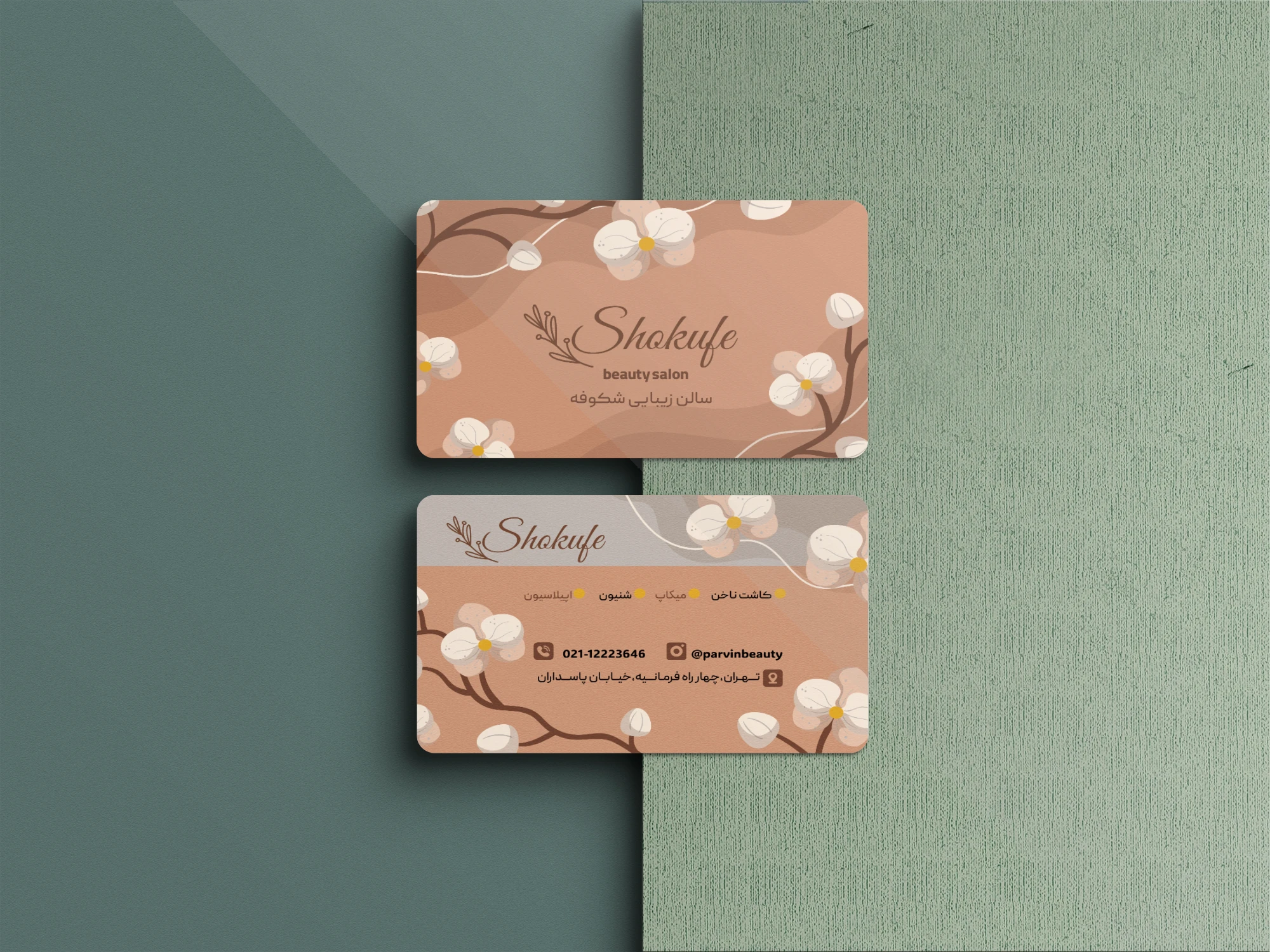 طراحی کارت ویزیت شیک و حرفهای برای سالن زیبایی شکوفه. در این طرح از المانهای طبیعی (شکوفه) و رنگهای ملایم برای القای حس زیبایی، آرامش و تخصص استفاده شده است. هدف از این طراحی، ایجاد یک هویت بصری جذاب و به یاد ماندنی برای سالن بوده است.