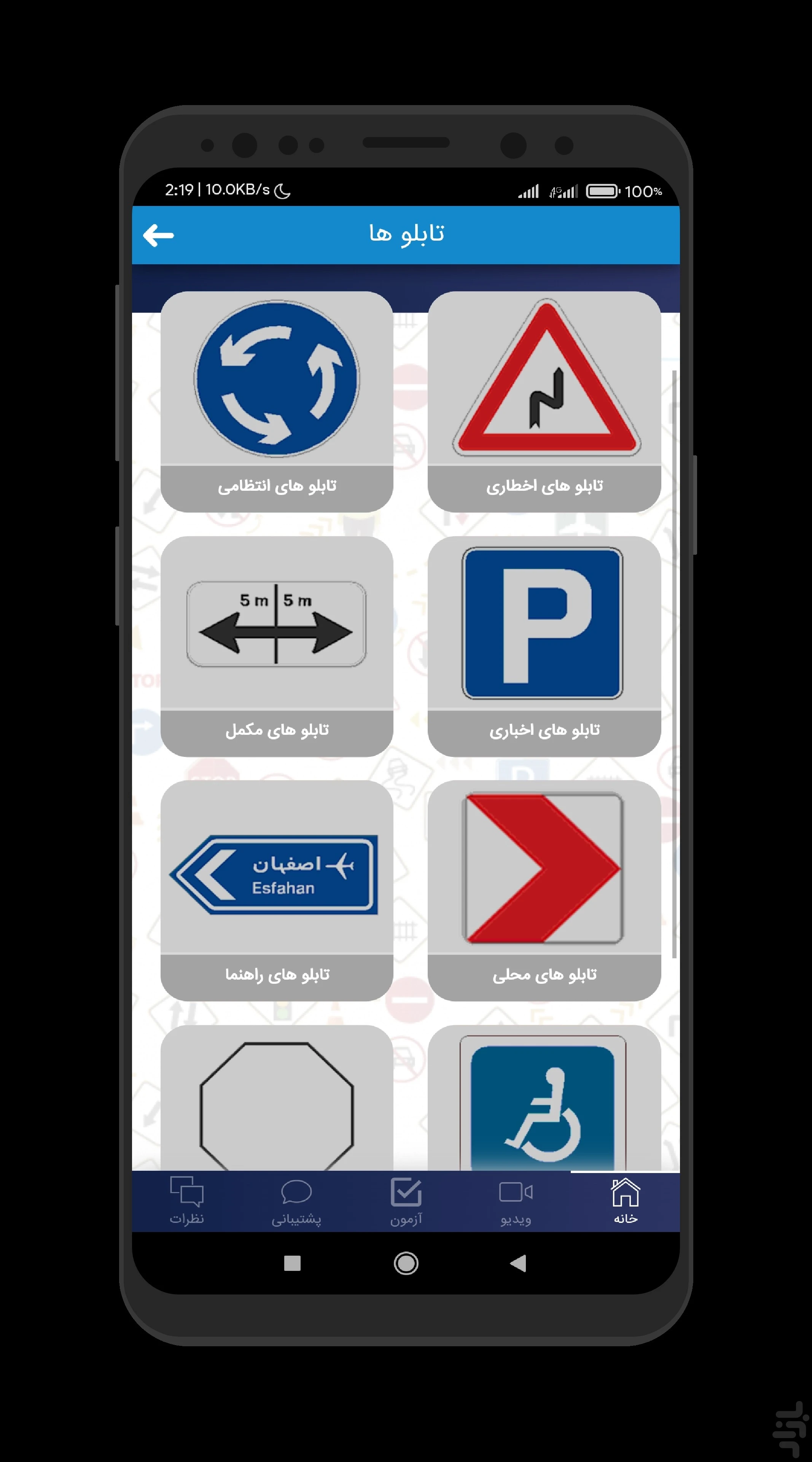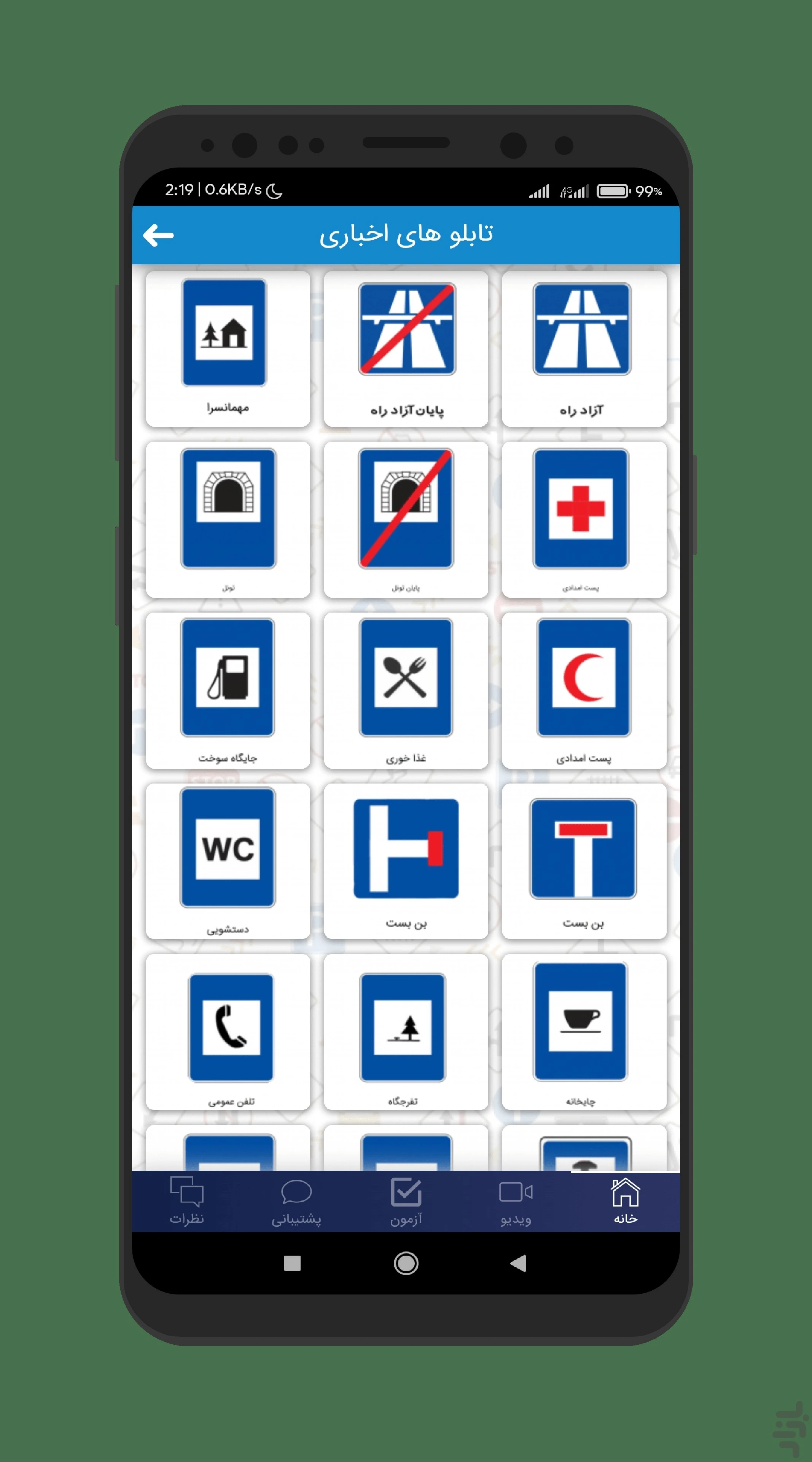 ✔ لیست تمامی تابلوهای راهنمایی و رانندگی در دسته بندی های مختلف جهت آموزش بهتر، با قابلیت مخفی نمودن نام تابلو جهت محک زدن حافظه و یادگیری بهتر و بخاطر سپردن راحتر