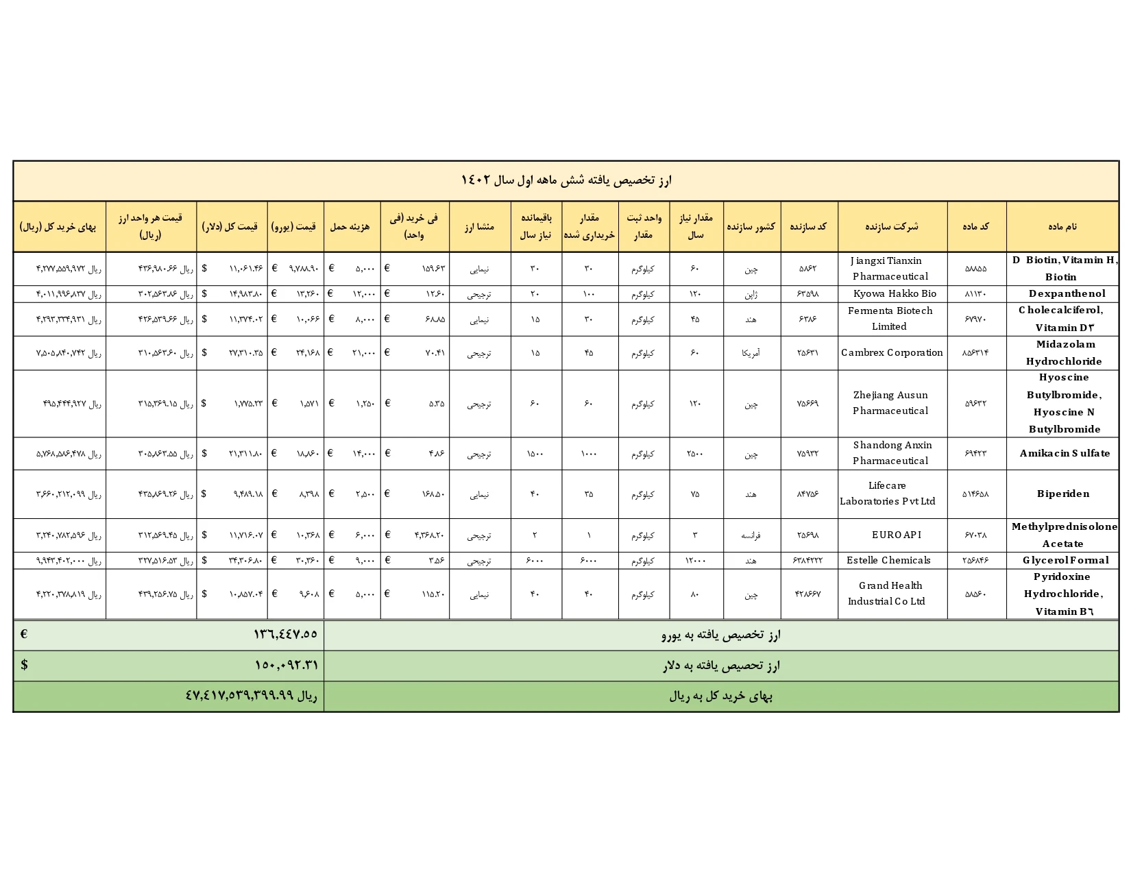 گزارش خرید ارزهای شش ماهه اول یک شرکت دارویی جهت واردات مواد اولیه با نرخ ارزهای غیرواقعی (اطلاعات واقعی نمیباشد)
