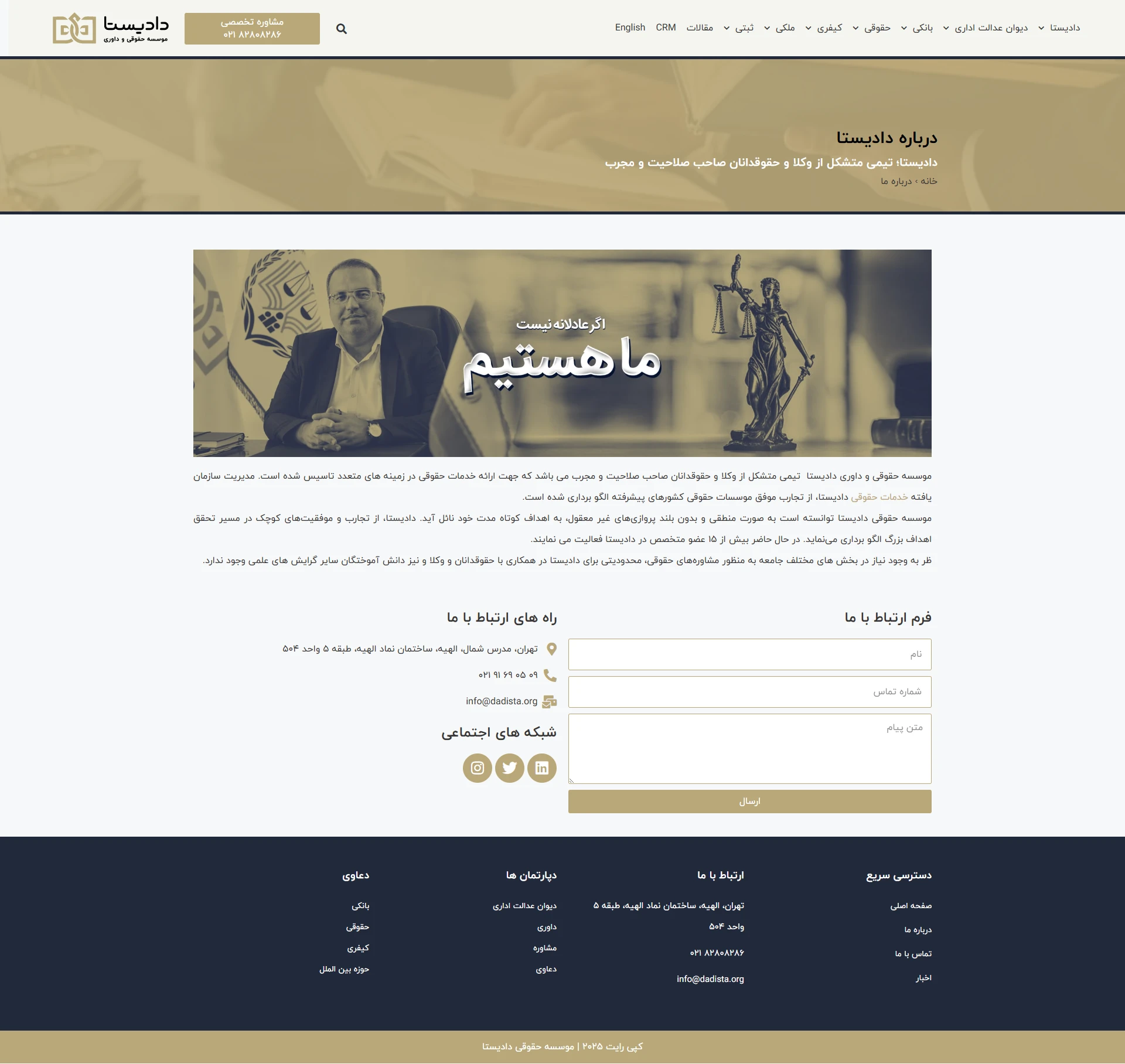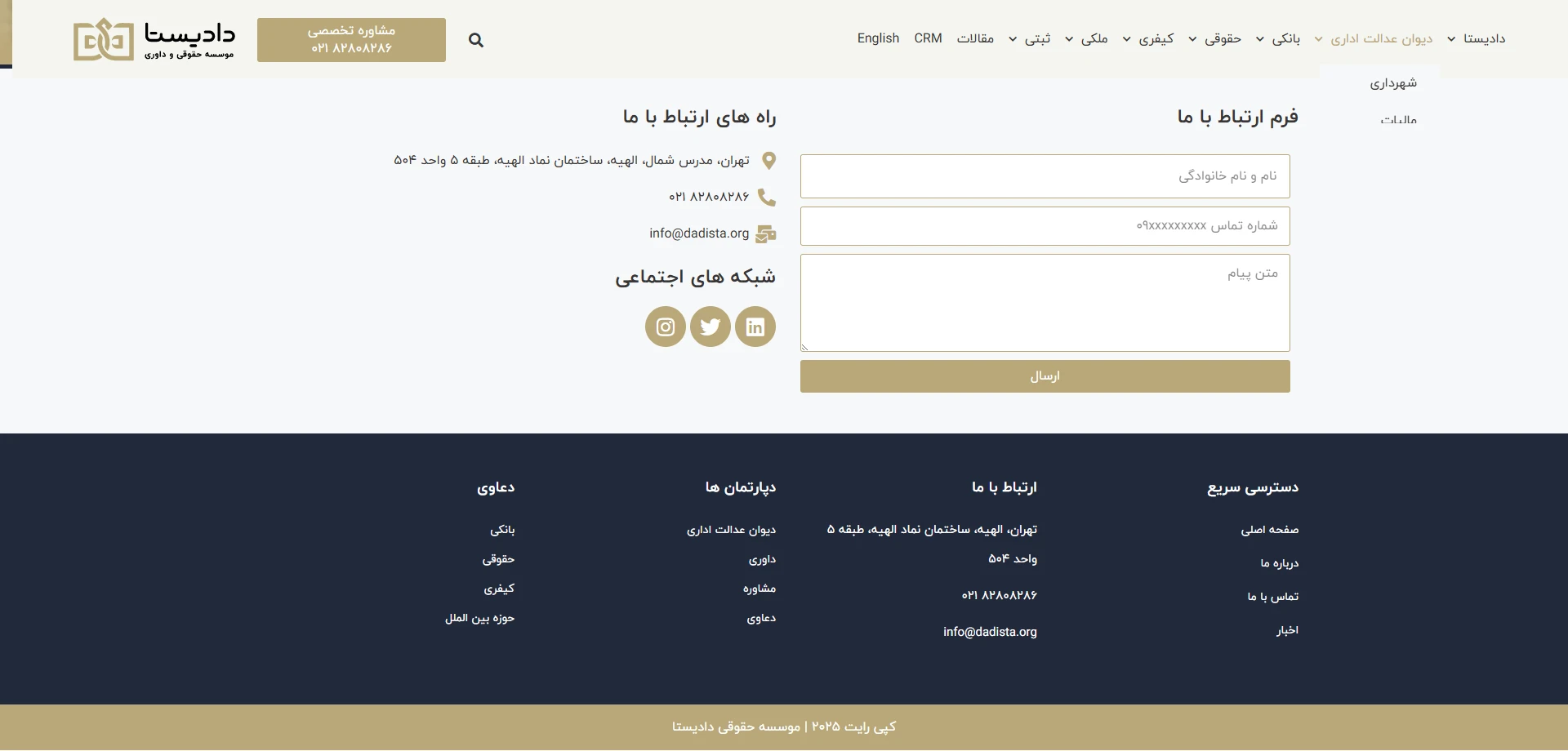 وبسایت مذکور یک پلتفرم حقوقی آنلاین است که با هدف ارائه مشاوره تخصصی، معرفی خدمات حقوقی و انتشار مقالات آموزشی در حوزه حقوق راهاندازی شده است. در این پروژه تمرکز بر ارائه تجربهای ساده و شفاف برای کاربران در دسترسی به مشاوره، مطالعه مقالات و استفاده از خدمات آنلاین بوده است. طراحی ظاهری وبسایت کاملاً حرفهای، مینیمال و متناسب با هویت بصری برند صورت گرفته و تمام صفحات با اصول طراحی واکنشگرا و بهینهسازی سئو ساخته شدهاند. همچنین فرمهای ثبت درخواست مشاوره و بخش مقالات بهگونهای طراحی شدهاند که بهراحتی توسط تیم محتوایی قابل بروزرسانی باشند.