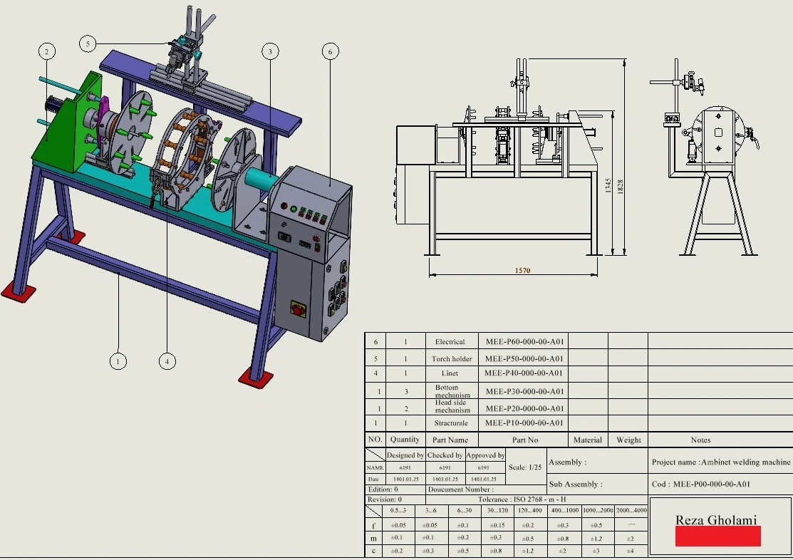 دستگاه مورد نظر با توجه به اعلام نیازمندی صنایع جهت جوش محیطی مخازن جدارنازک طراحی و ساخته شد . این دستگاه از 6 قسمت تشکیل شده است که به صورت ساب اسمبل مدلسازی و مجددا در یک فایل اسمبل گردیده است. از تمام قطعات و مجموعه ها نقشه دراوینگ تهیه شده و از روی نقشه ها فرایند تولید انجام گرفته است. در مواردی که قطعات نیازمند تولید با دستگاه سی ان سی را داشته از مدل های فایل IGS تهیه و مراحل ساخت انجام پذیرفته است.انجام نقشه های ساختی مجموعه دستگاه جوش محیطی به پیوست آورده شده است.علاوه بر مدلسازی با نرم افزار سالیدورک دستورالعمل کار با دستگاه نیز تدوین شده است.