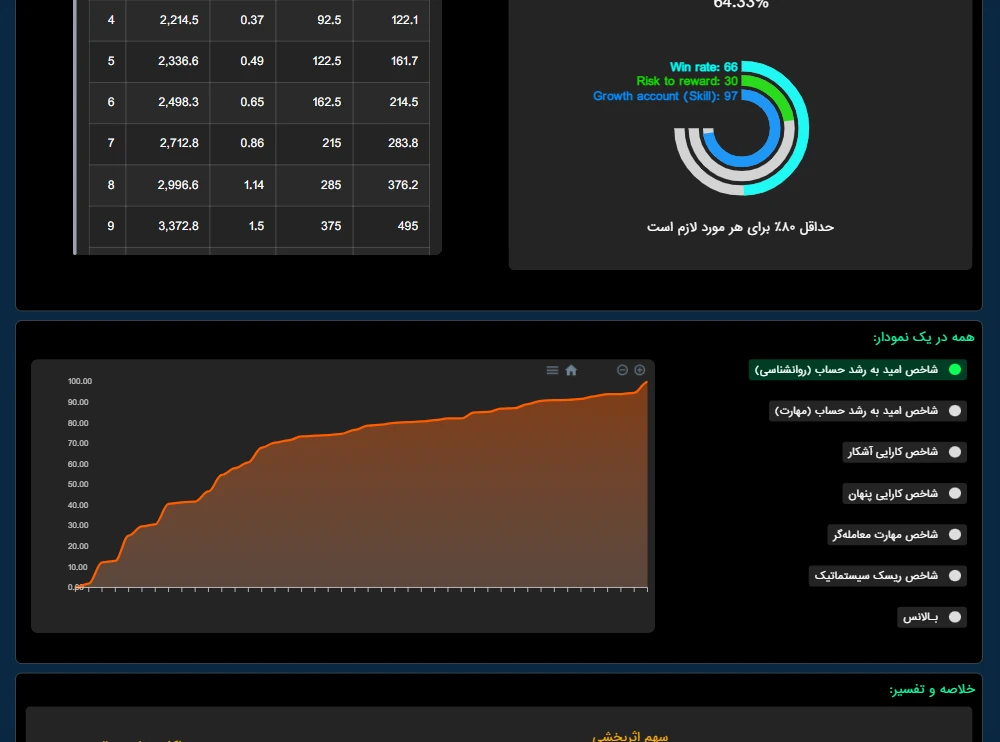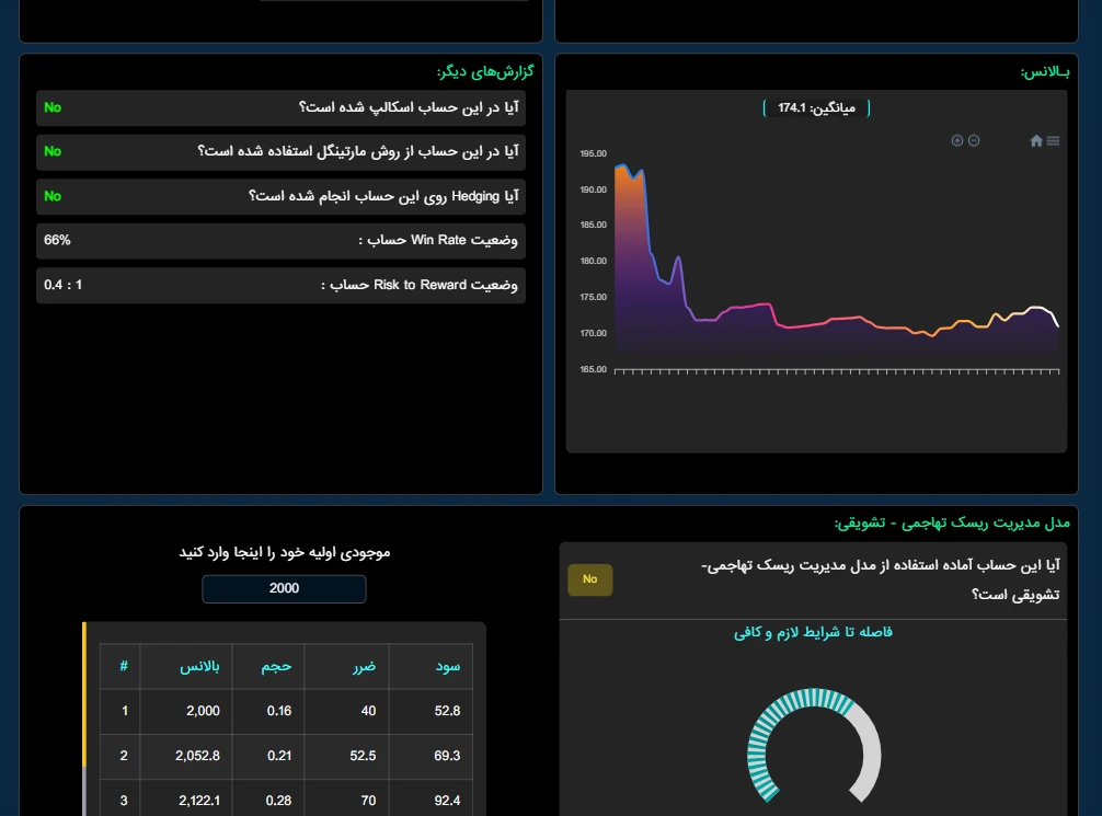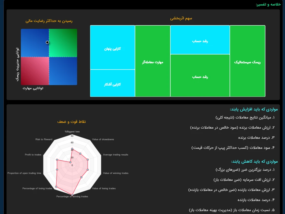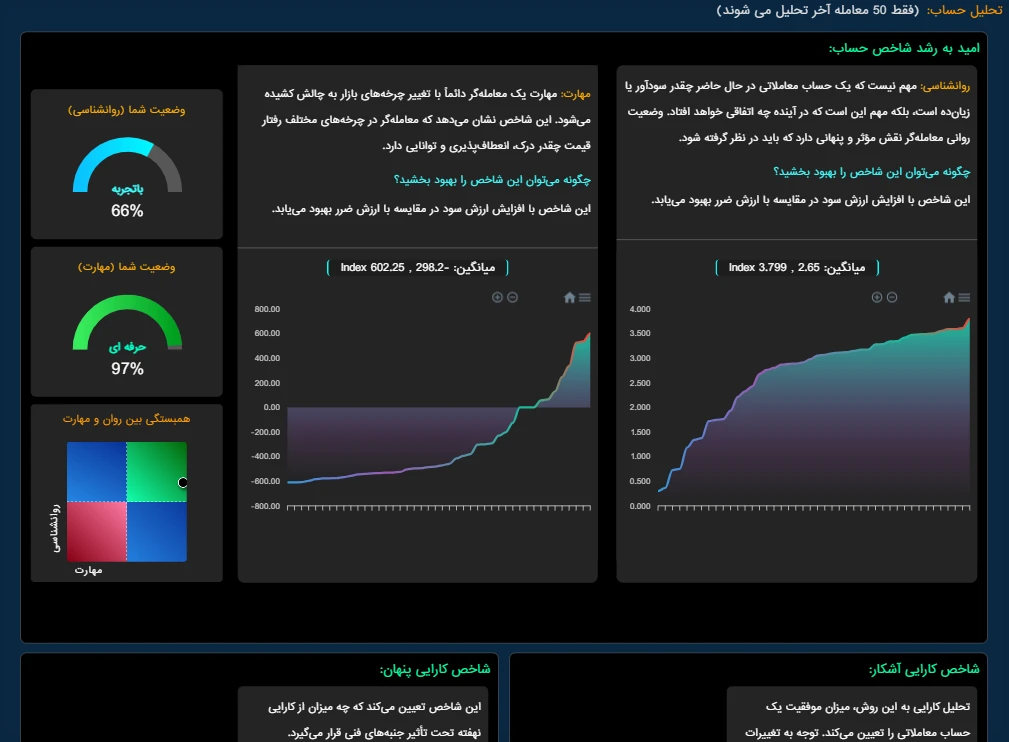 در این پروژه اطلاعات معاملاتی کاربران از طریق یک اکسپرت متاتریدر به سرور ارسال می شود و بعد از پردازش و گذشتن از فیلترهای مختلف، اطلاعات کامل و جامعی را در قالب نمودارهای مختلف ارائه می کند.