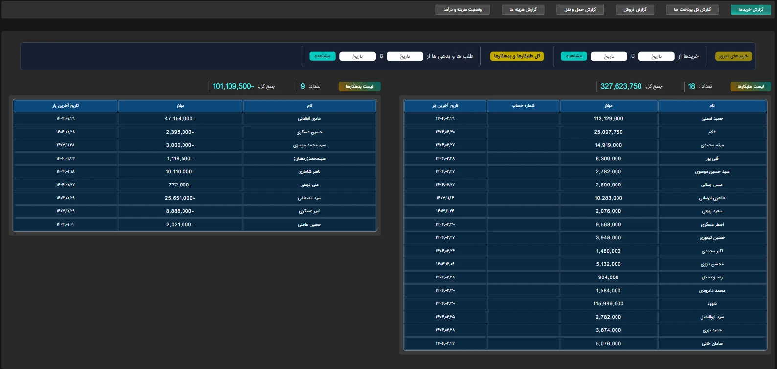 در این نرم افزار سیستمی طراحی شد که کارفرما بتواند کل هزینه ها، درآمدها، فروش ها، خریدها، مشتریان، راننده ها و... را مدیریت کند و در لحظه وضعیت عملکرد کسب و کار خود را ببیند.