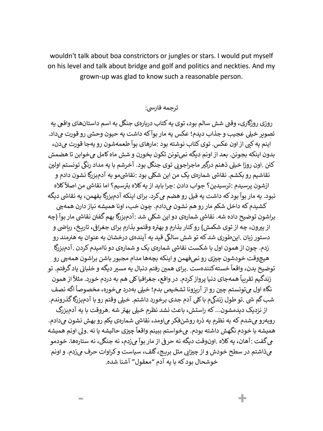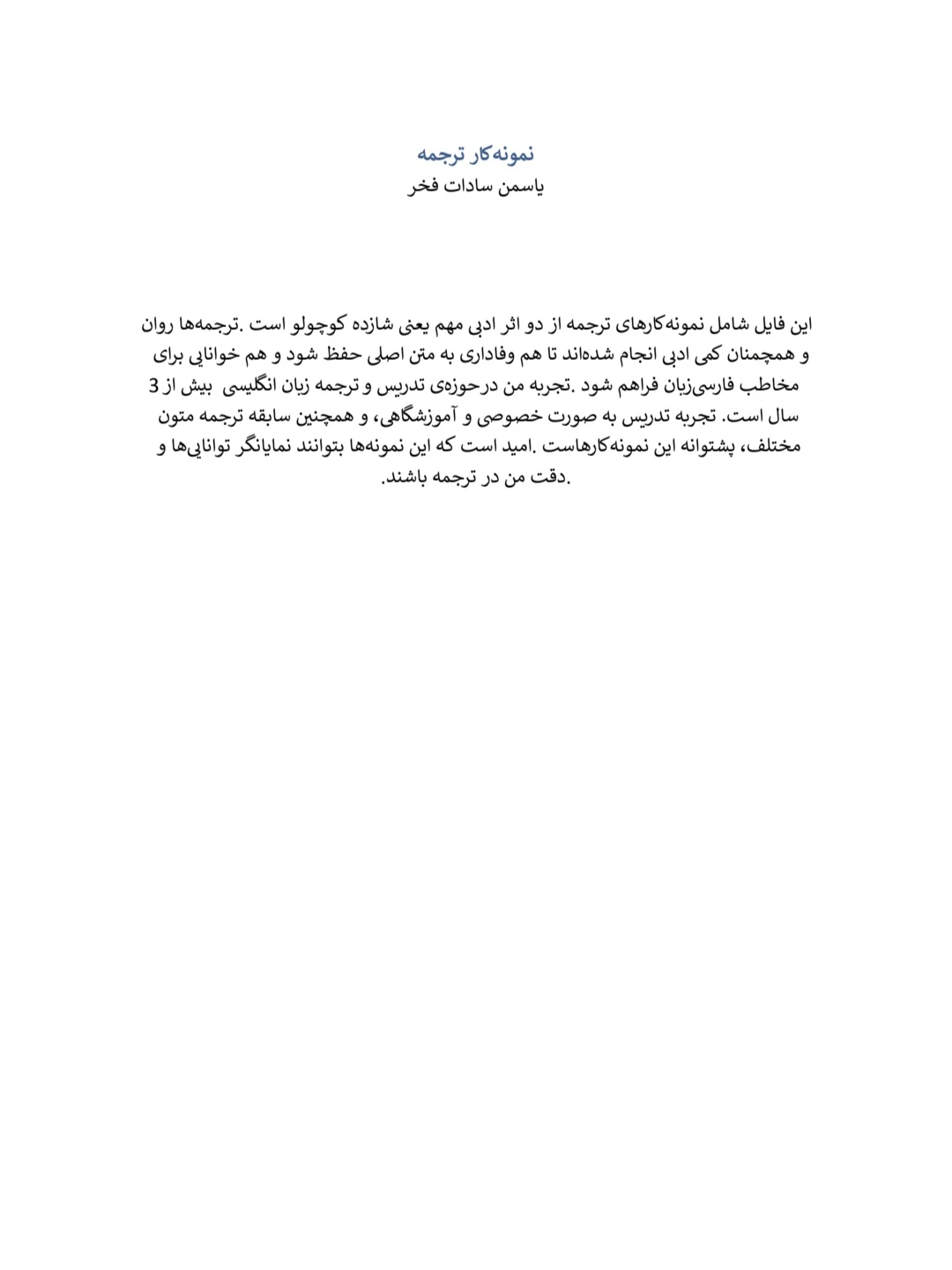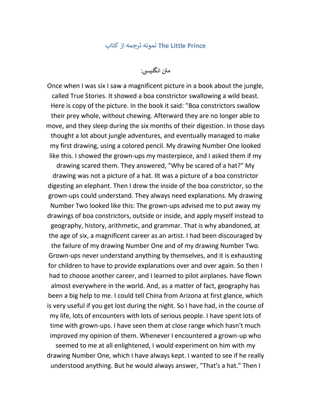 نمونه ترجمه از کتاب The Little Prince - این نمونه شامل نمونهکار ترجمه از اثر ادبی مهم یعنی شازده کوچولو است. ترجمه روان و همچمنان کمی ادبی انجام شدهاند تا هم وفاداری به متن اصلی حفظ شود و هم خوانایی برای مخاطب فارسیزبان فراهم شود. تجربه من در حوزهی تدریس و ترجمه زبان انگلیسی بیش از 3 سال است. تجربه تدریس به صورت خصوصی و آموزشگاهی، و همچنین سابقه ترجمه متون مختلف، پشتوانه این نمونهکارهاست. امید است که این نمونهها بتوانند نمایانگر تواناییها و دقت من در ترجمه باشند..