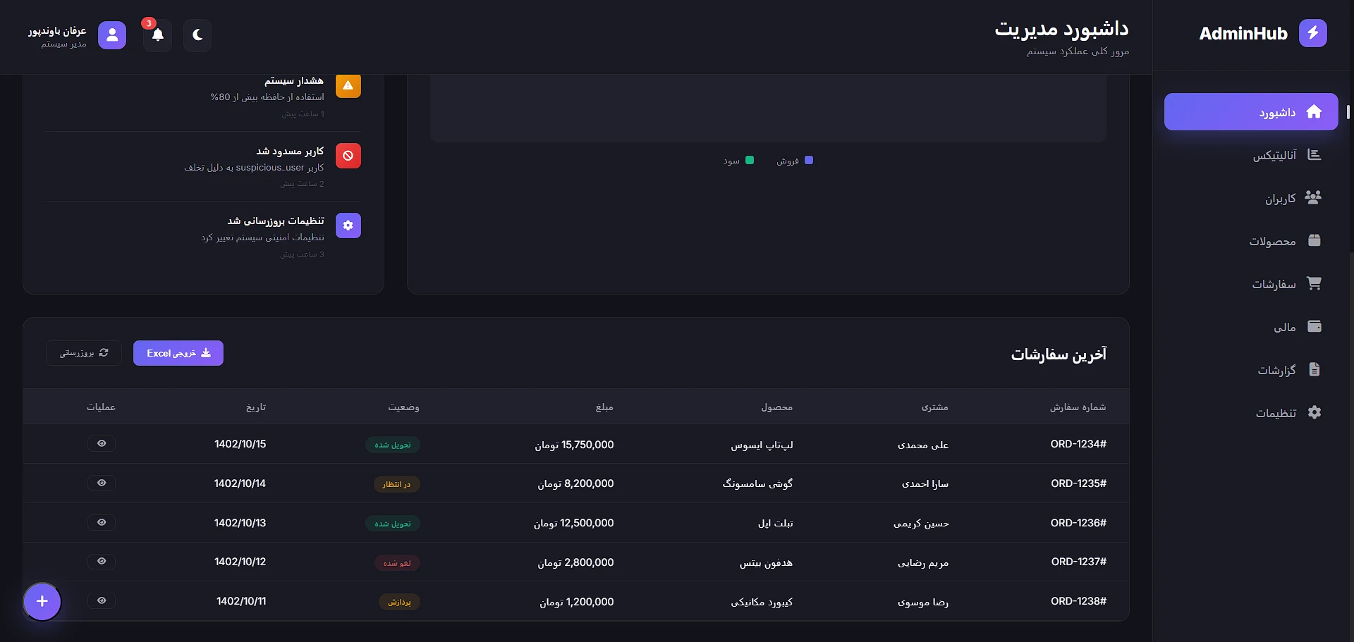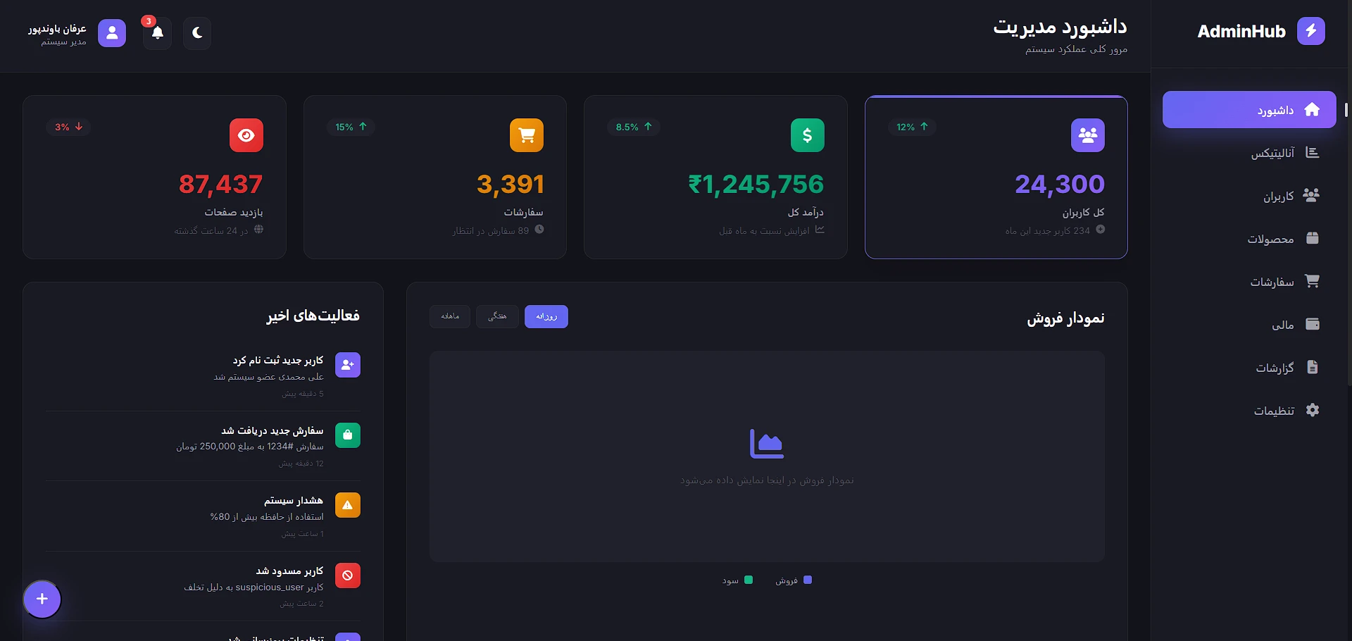 پنل مدیریت AdminHub - داشبورد حرفهای با نسخه دارک و لایت