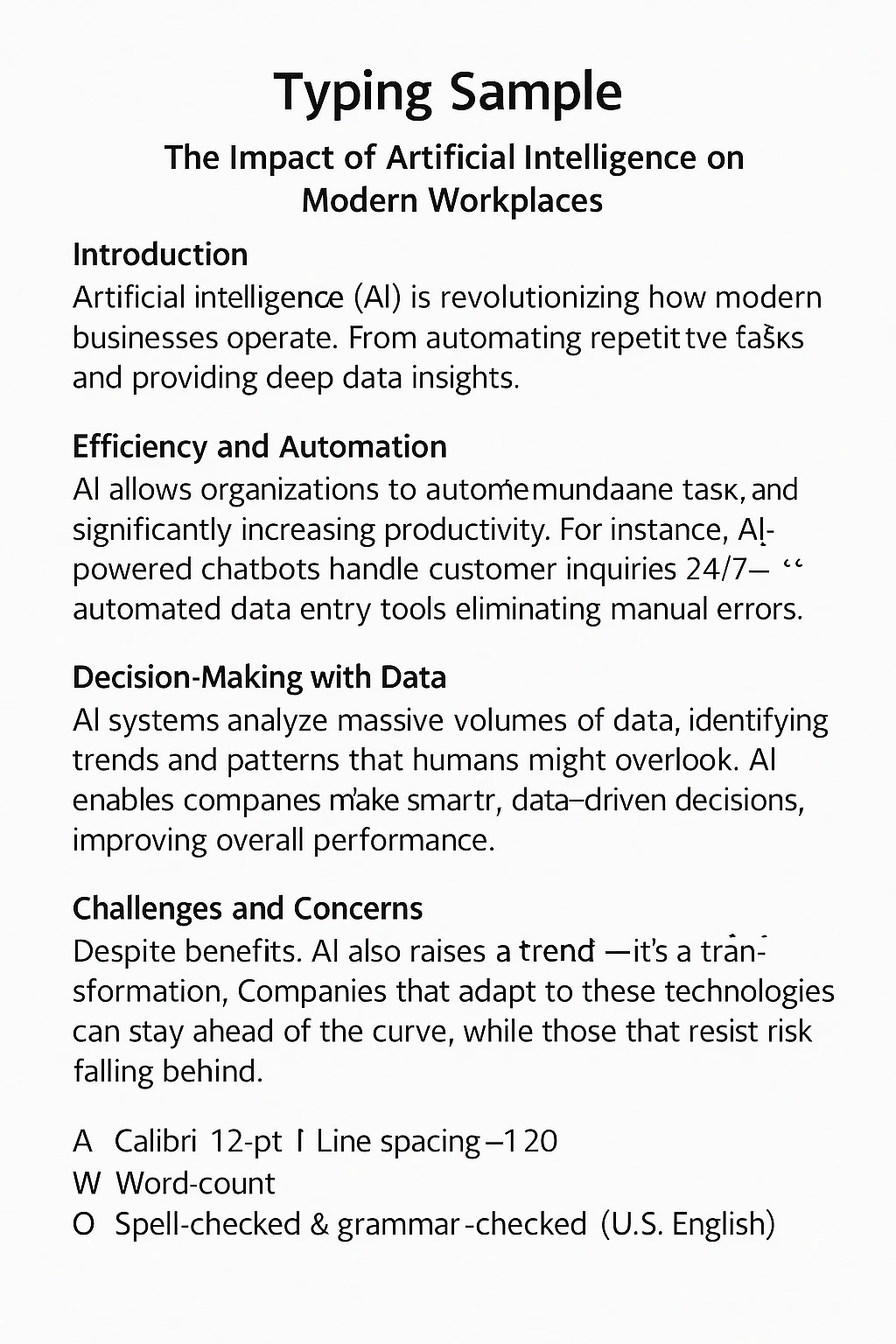 نمایش توانایی تایپ سریع، صحیح و با رعایت اصول نگارشی و ساختار متنی حرفهای به زبان انگلیسی.
