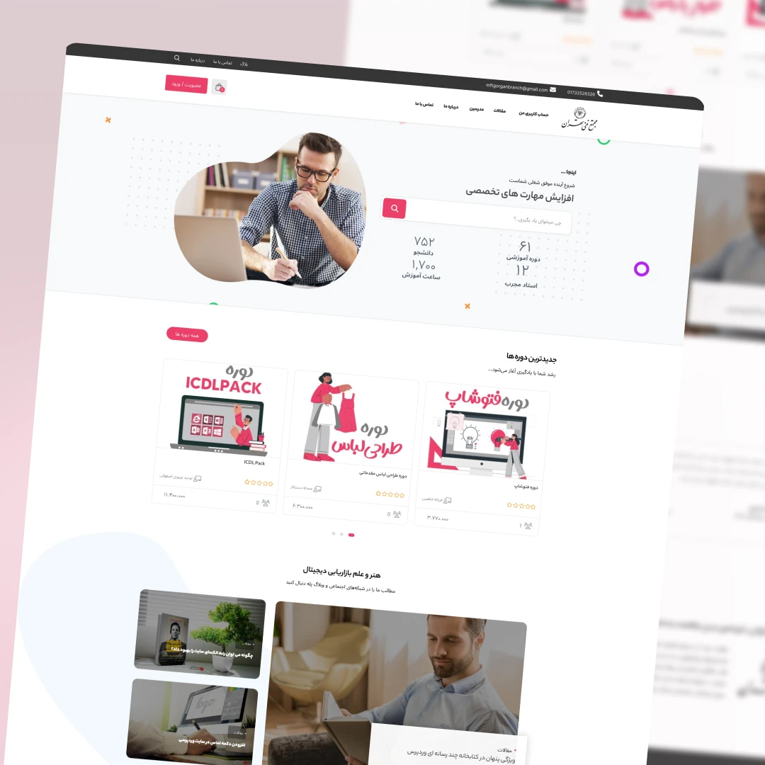 فروش و ثبت نام دوره های حضوری و مجازی به کمک این سایت اتفاق می افته که توی این سایت فرم های ثبت نام زیادی استفاده کردیم و بخش هایی از فروش فایل و صفحه اصلی و بخش مربوط به داده ها کدنویسی شده است