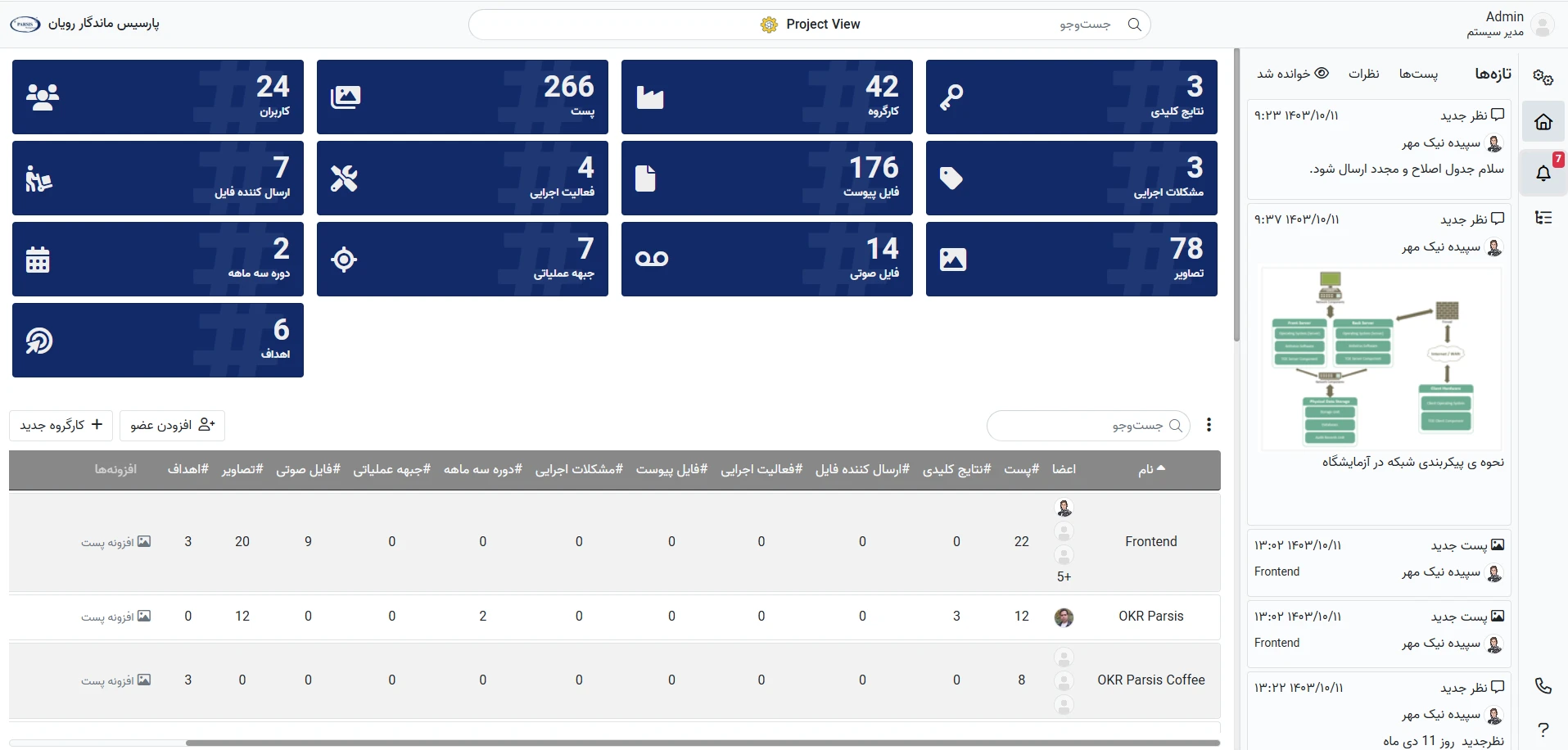 ثبت و مدیریت محتوای مرتبط با کار (عنوان، توضیحات، دستهبندی، برچسب، پیوست) و جستجو/فیلتر آسان.