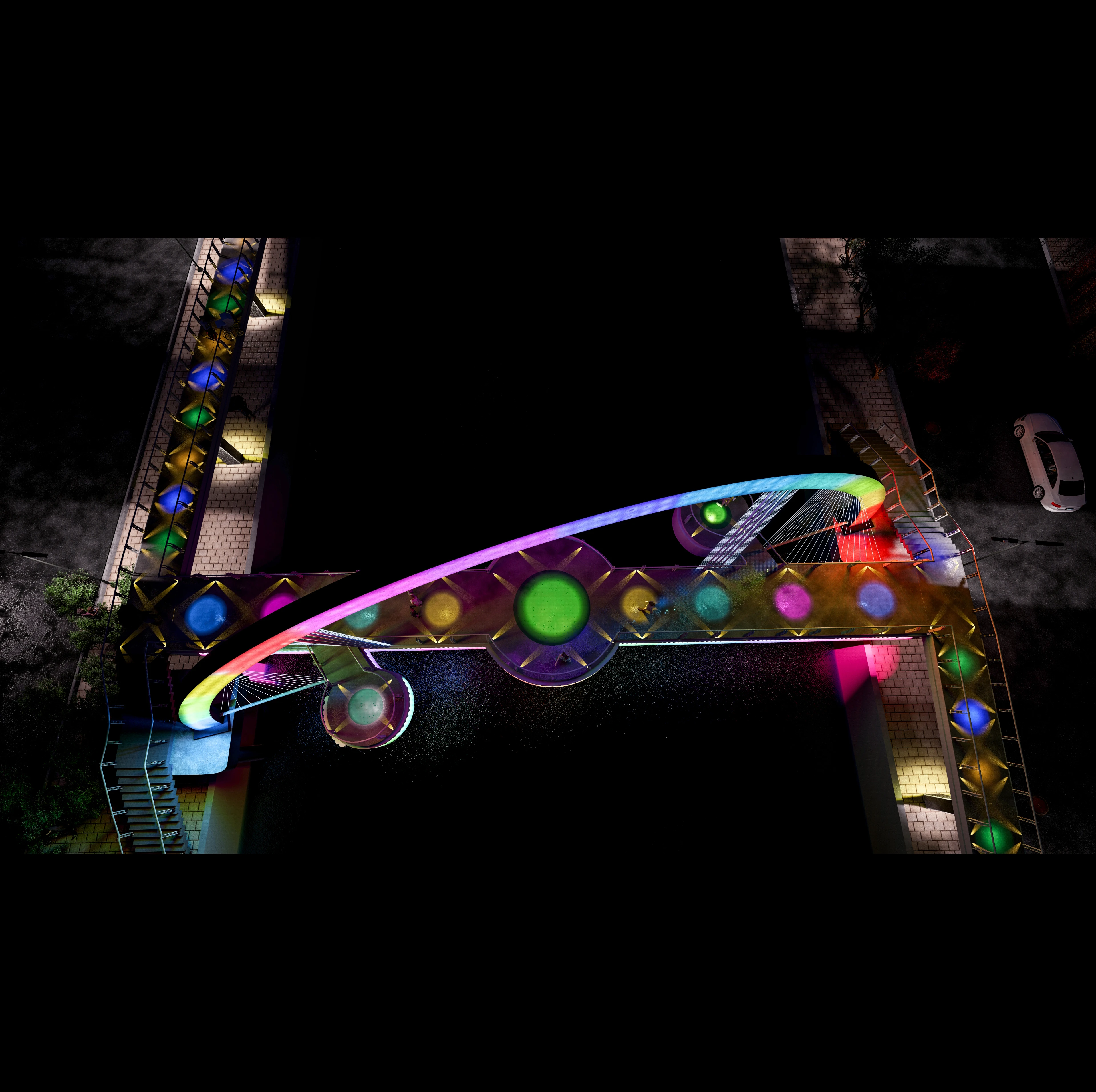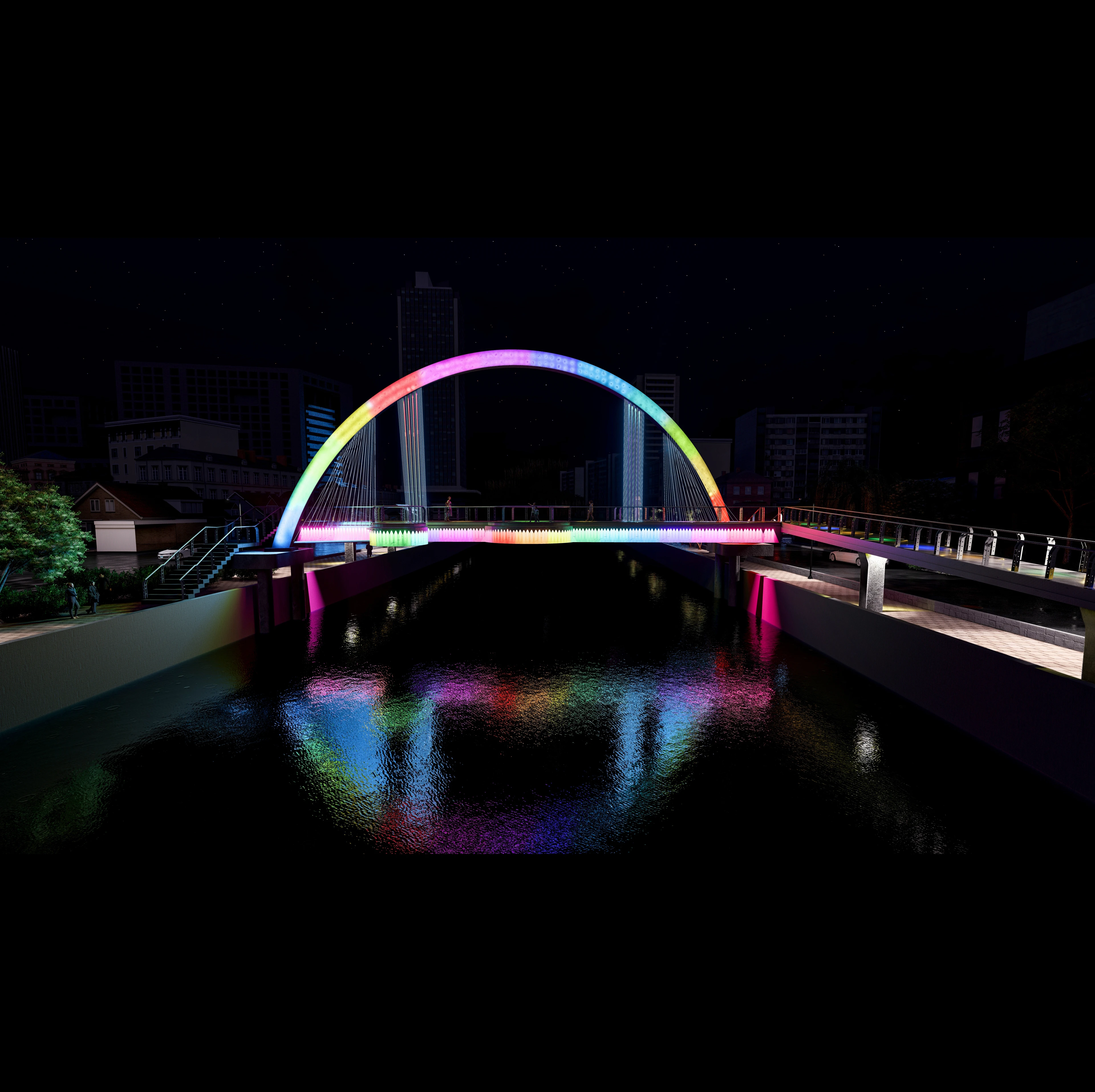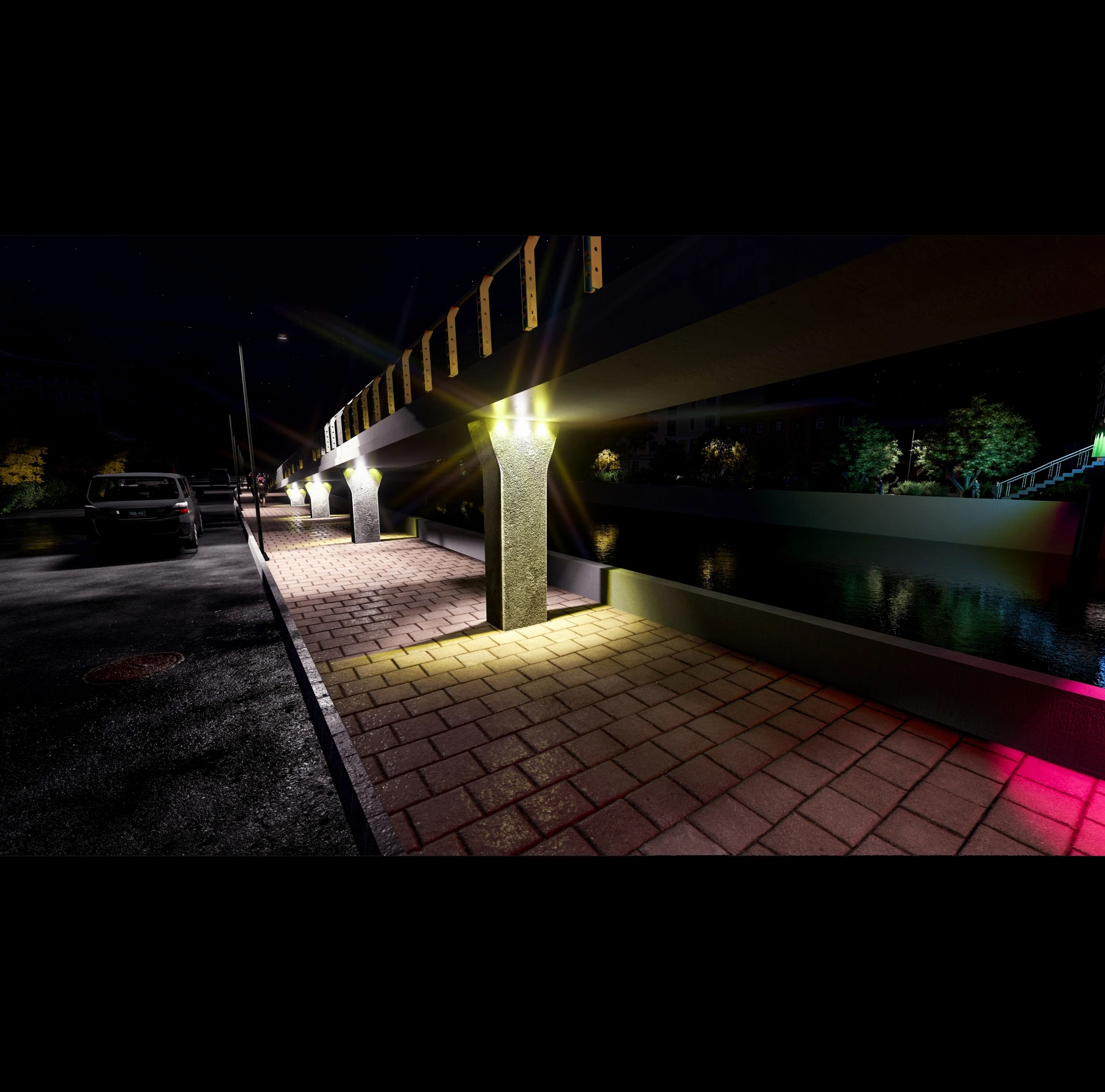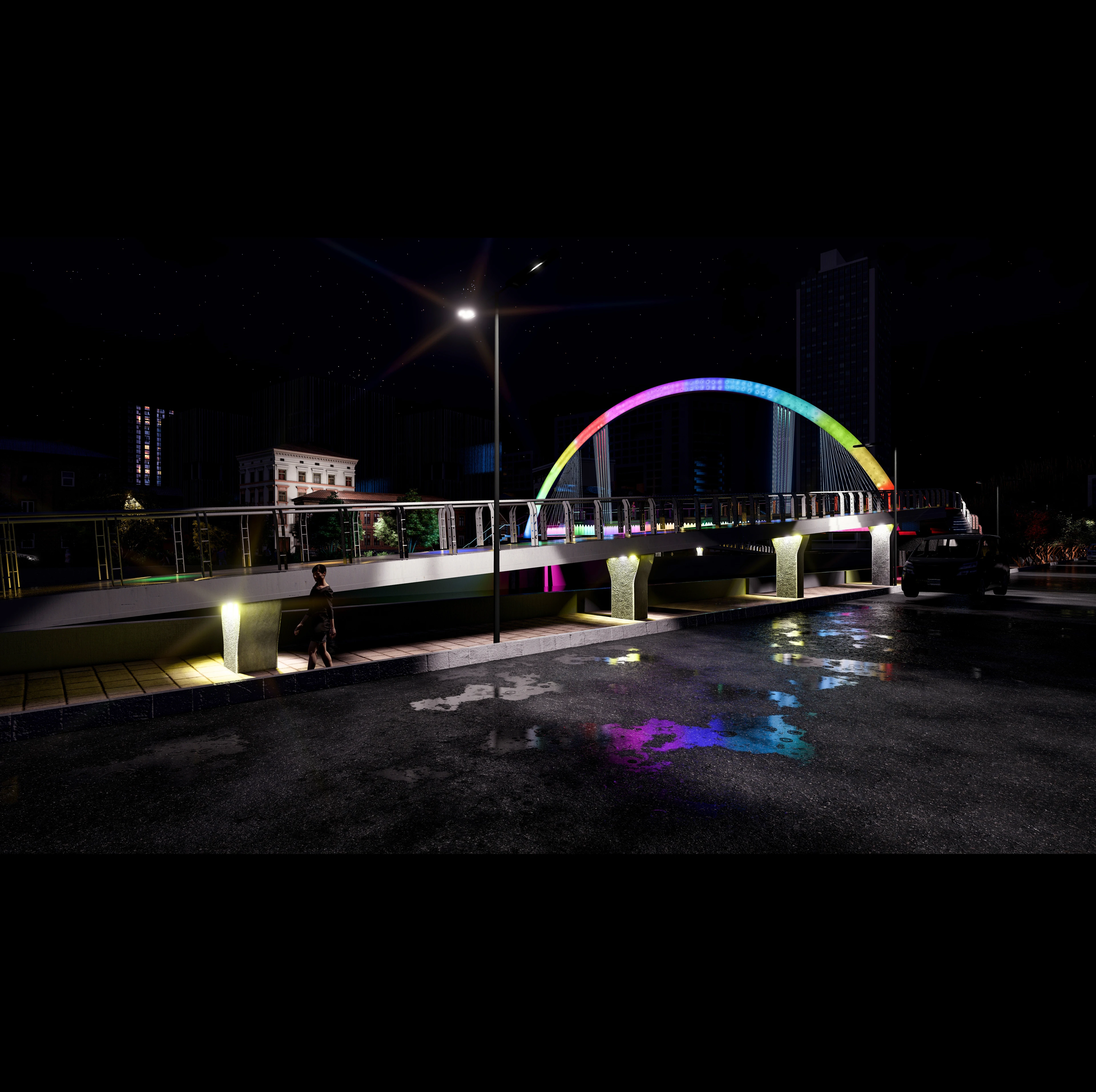 پروژه شامل نور پردازی بدنه پل ، رمپ ها ، پله ها ، استفاده از انعکاس نور در آب و برنامه ریزی نور و حالات مختلف رقص نور نسبت به سفارش کارفرما.