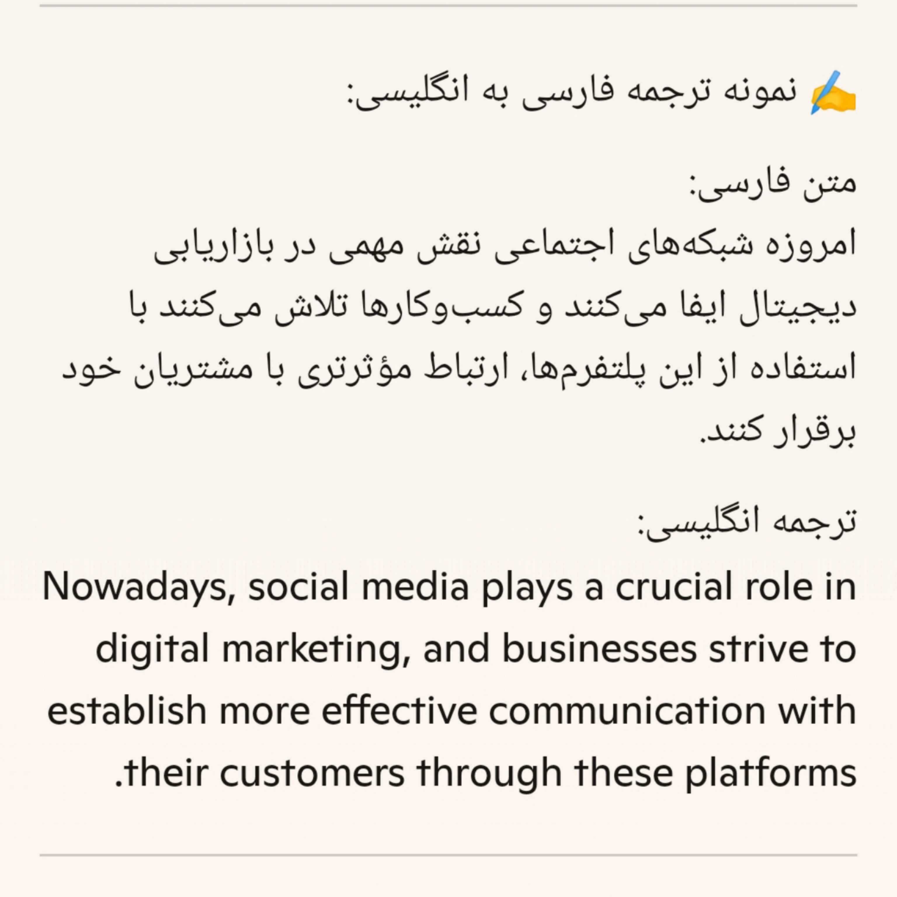 این پروژه شامل ترجمه یک متن تخصصی در زمینه بازاریابی دیجیتال از زبان فارسی به انگلیسی بود. ترجمه بهصورت روان، دقیق و مطابق با اصطلاحات رایج این حوزه انجام شد.