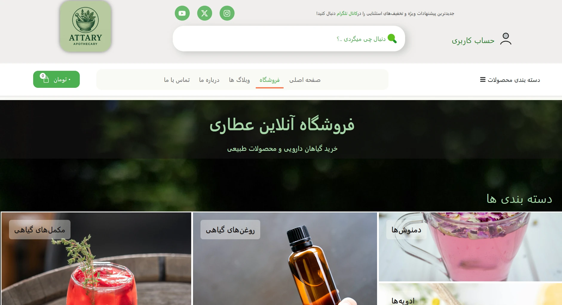 سایت ساخته شده با وردپرس عطاری آنلاین ریسپانسیو و موبایل فرندلی سرعت بالای سایت به دلیل استفاده از قالب سبک (hello elementor) طراحی مدرن