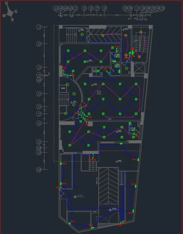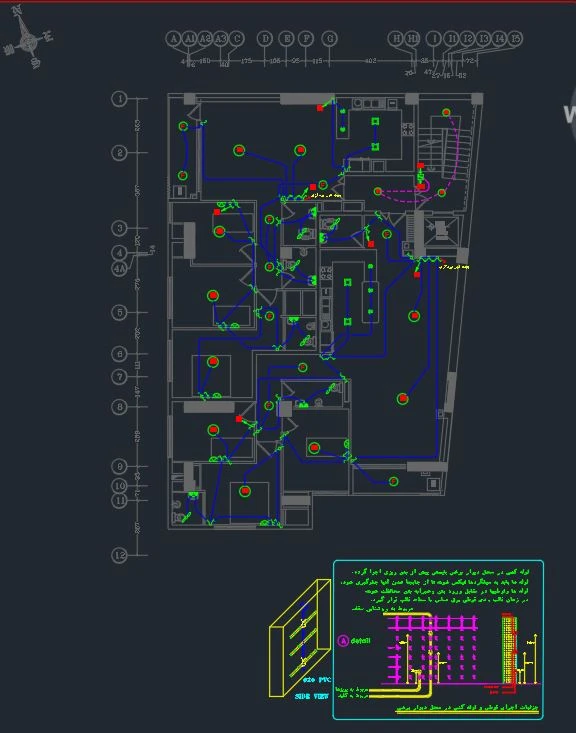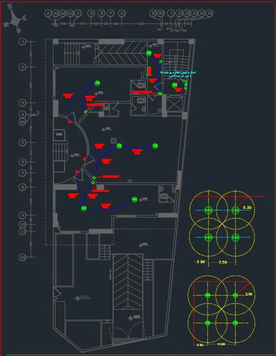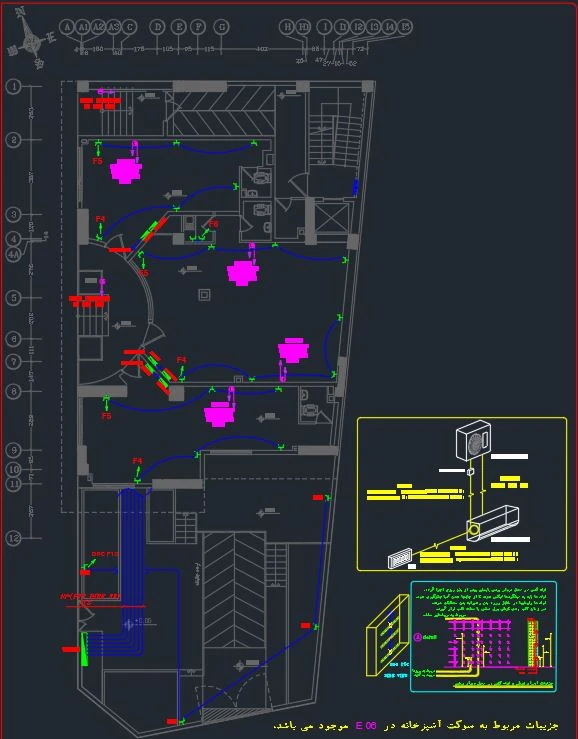 این پروژه شامل طراحی و محاسبات سیستم روشنایی ، پریز و کلید ها ، سیستم جریان ضعیف(مانند آنتن و تلفن) ، سیستم اعلام حریق و چاه ارت می باشد. همچنین شامل نقشه جزییات و دیاگرام تابلوها و رایزر هاست.