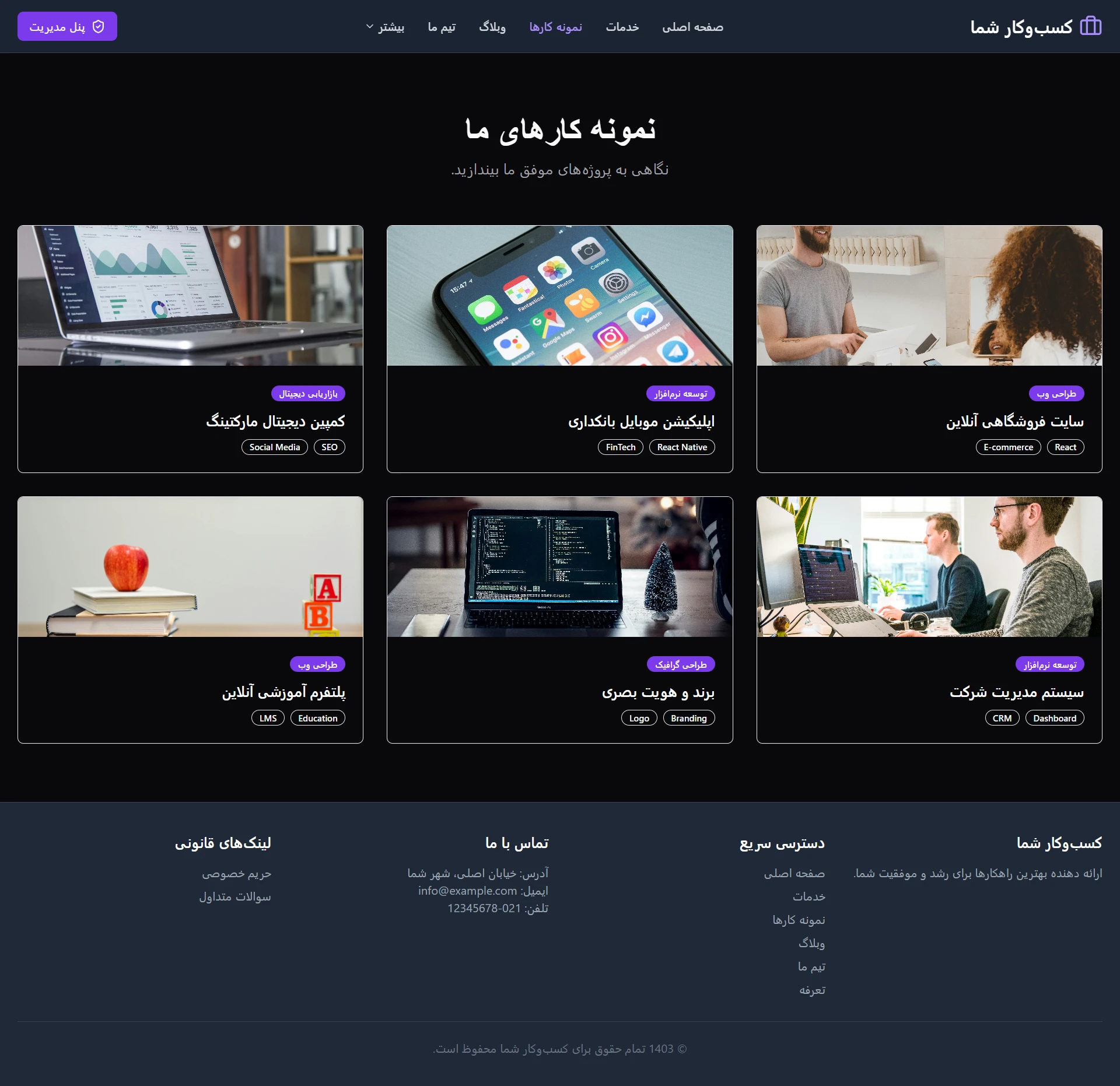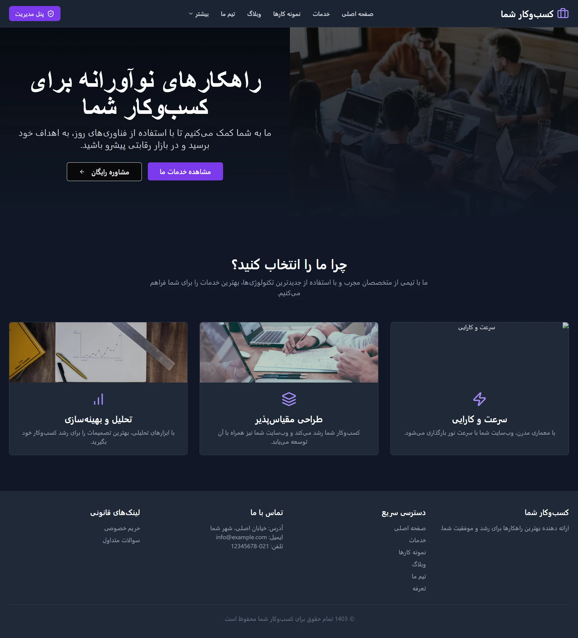 این پروژه یک راه حل ۱۰۰٪ سفارشی و نمادی از تفکر مهندسی است که برای کسبوکارهای مدرن و به عنوان جایگزینی برای قالبهای آماده ساخته ام. این پلتفرم برتری مطلق توسعه سفارشی را در سه حوزه کلیدی نمایش میدهد: