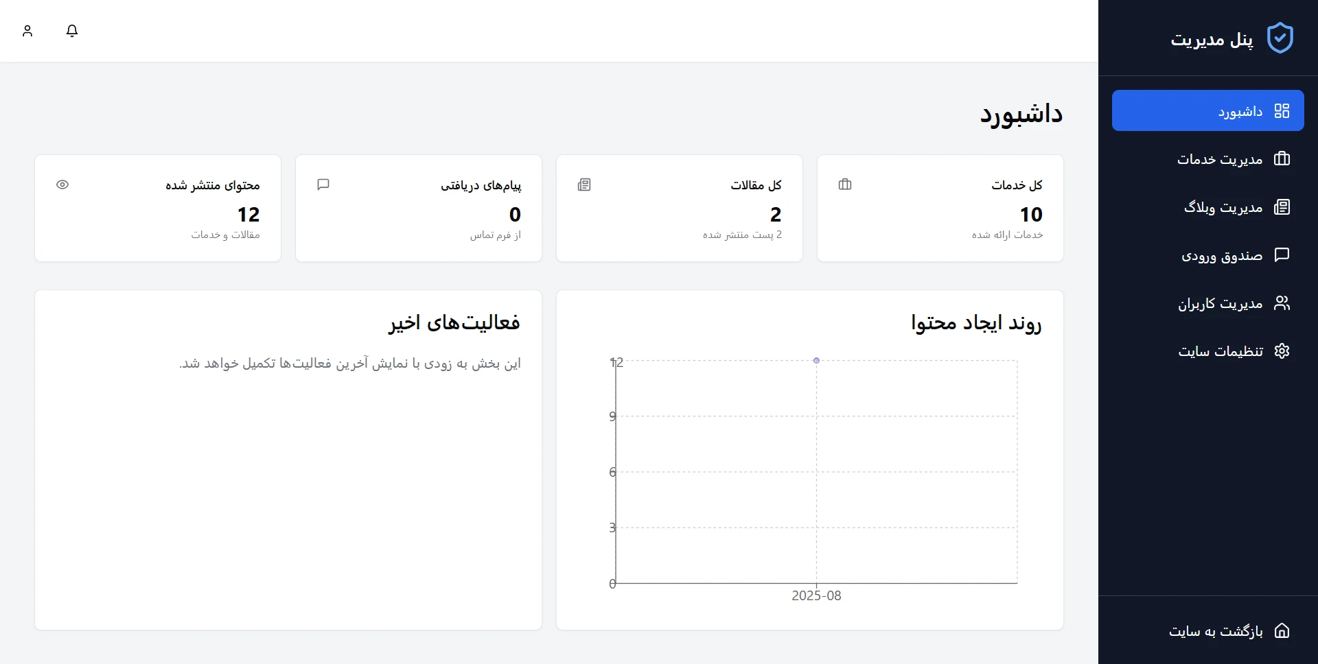 پنل مدیریت (CMS) اختصاصی: یک پنل مدیریت ساده و قدرتمند که برخلاف CMSهای عمومی، دقیقاً برای نیازهای مدیر طراحی شده است.