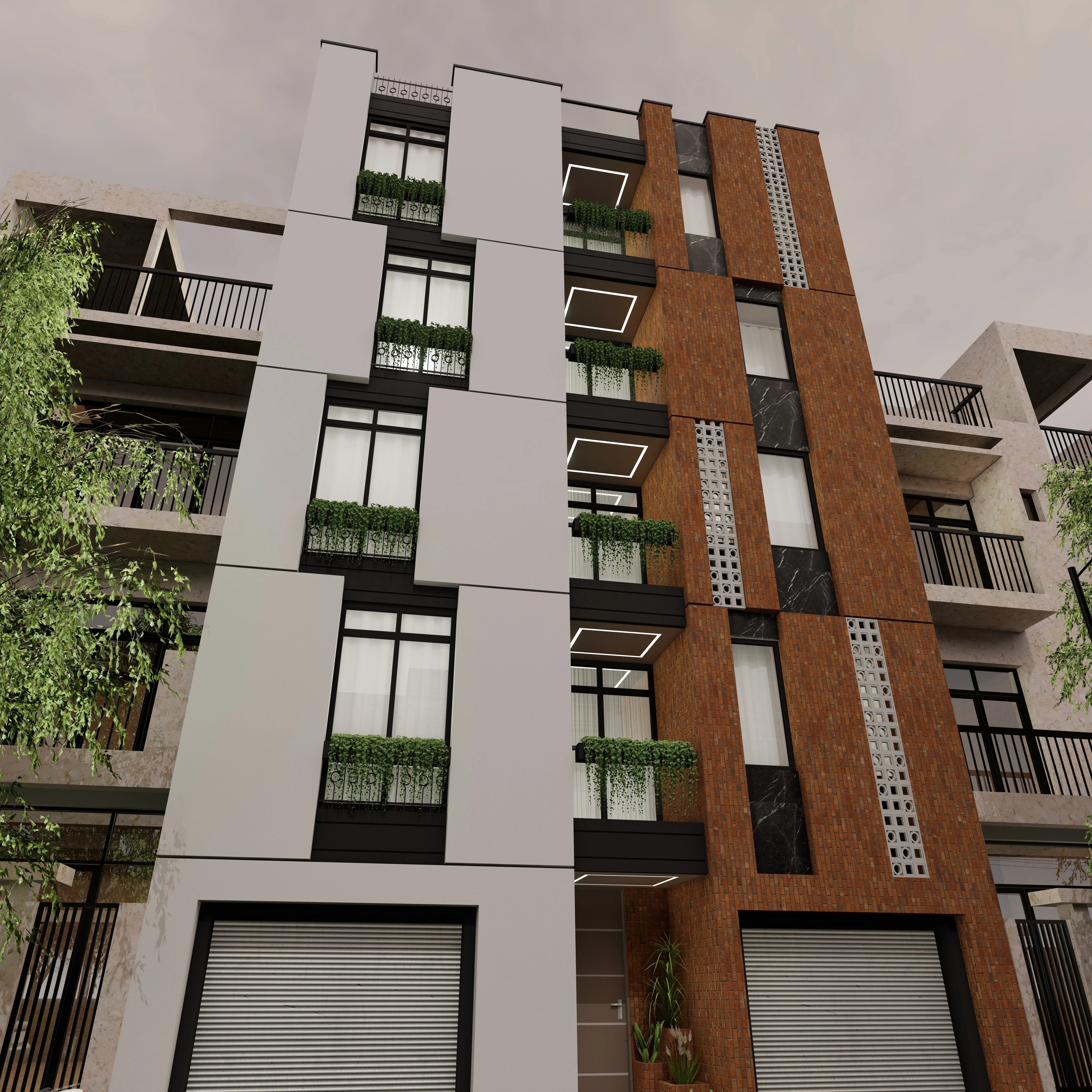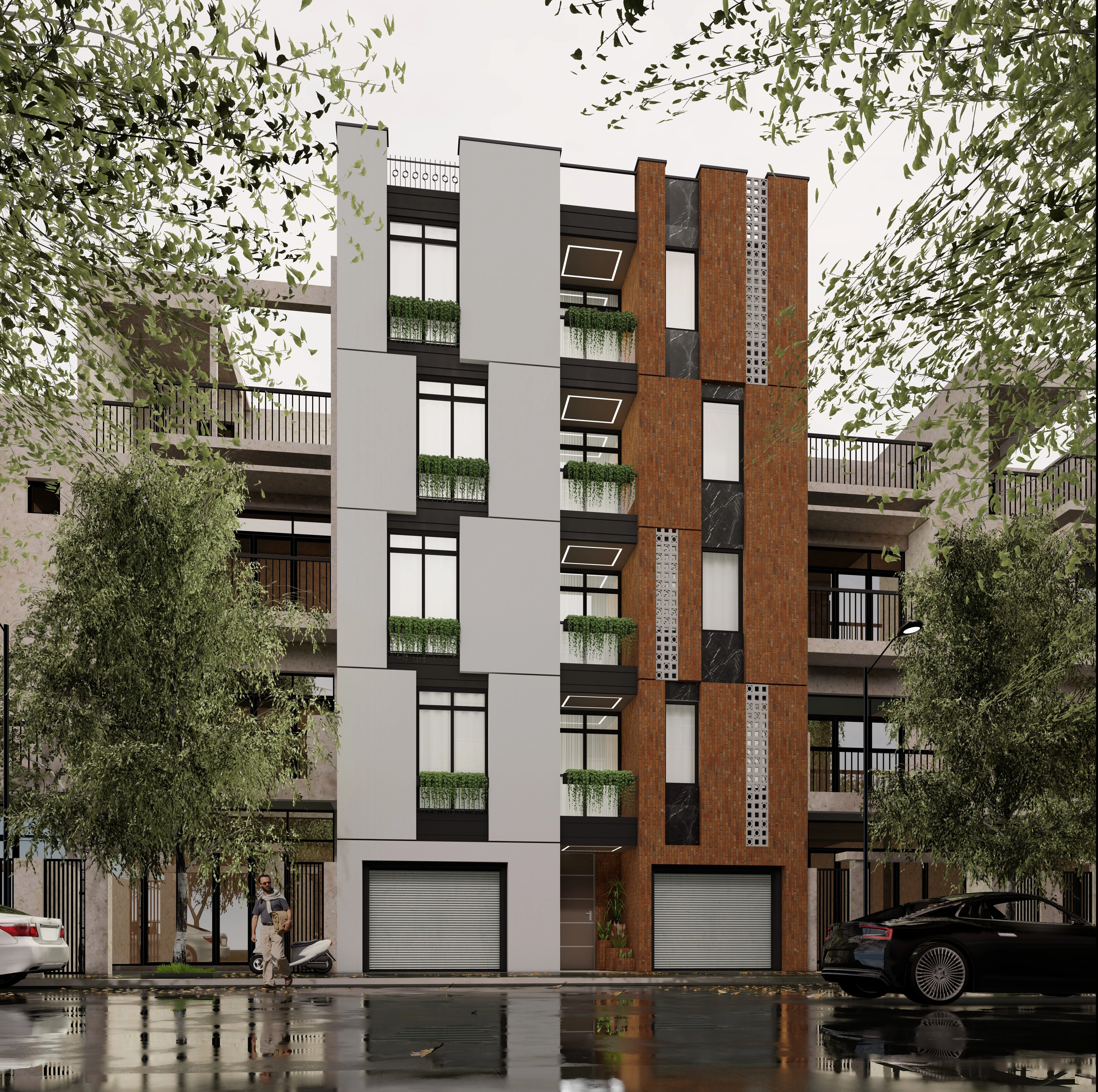 طراحی نما با ترکیب دو متریال سنگ و آجر به منظور ترکیب سنت و مدرنیته در طراحی
