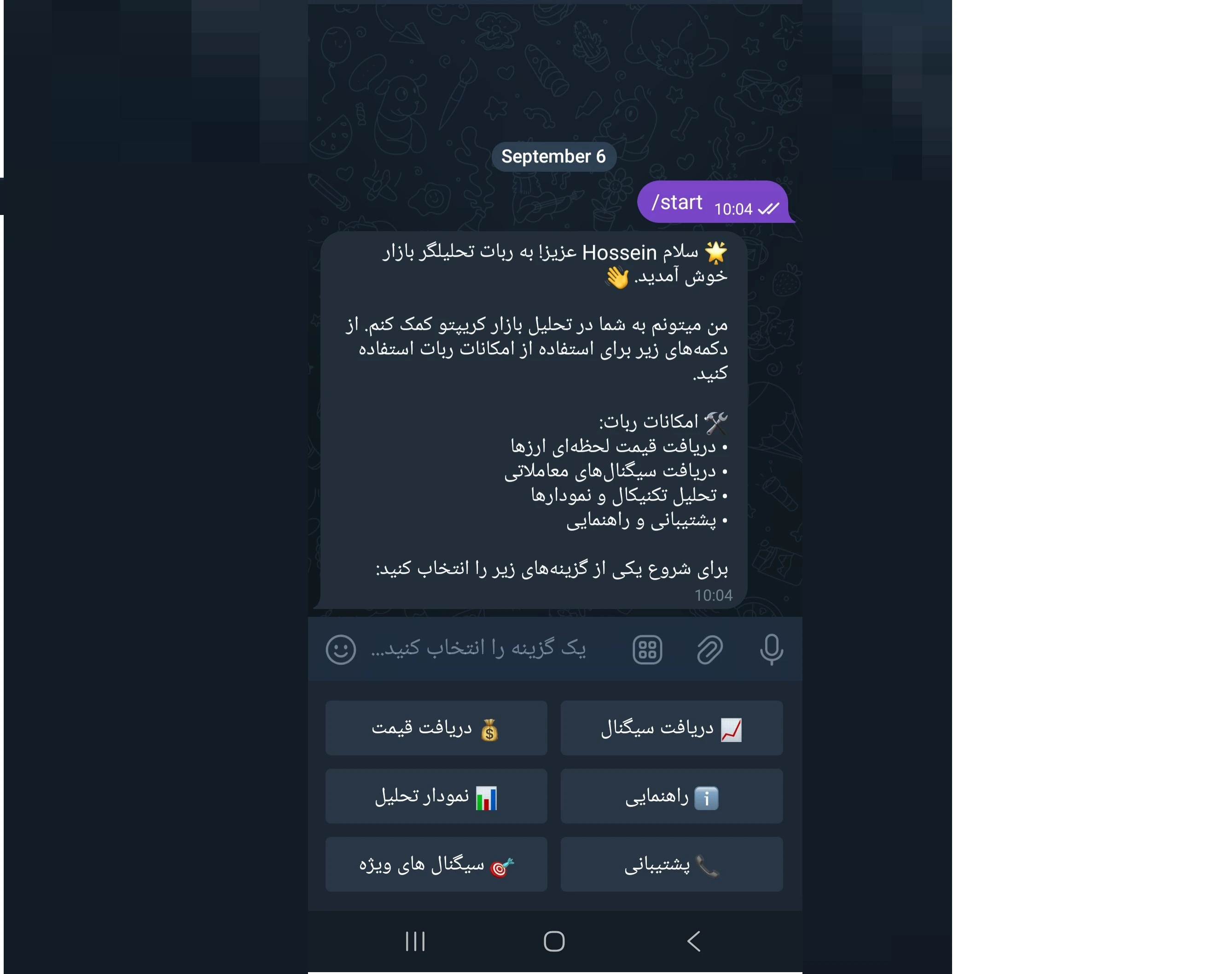 ک ربات تلگرام هوشمند با طراحی مدرن و قابلیتهای پیشرفته تحلیل بازارهای مالی که با آخرین تکنولوژیهای برنامهنویسی توسعه داده شده است.