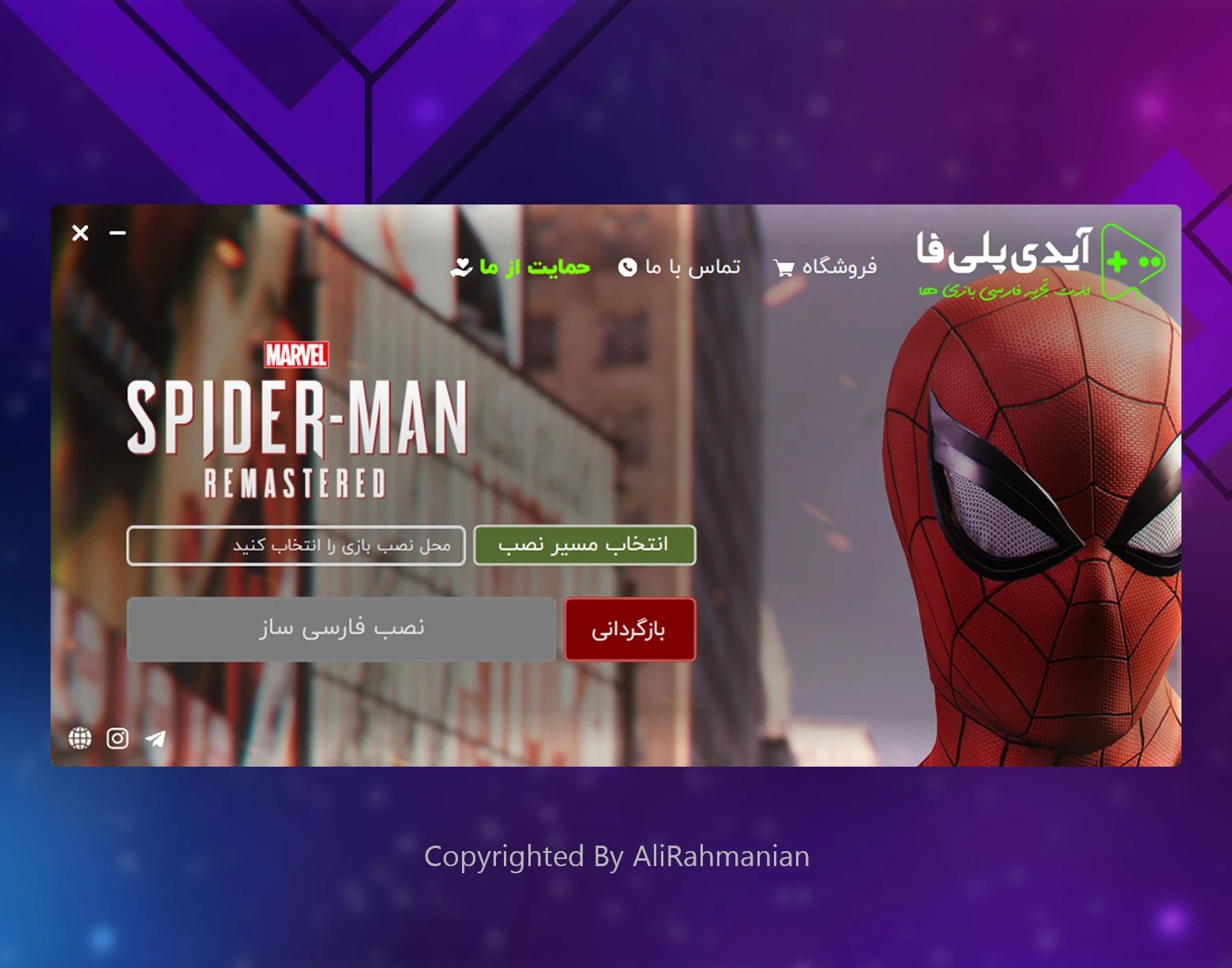 مختصر: هدف این نرم افزار، فارسی سازی بازی های رایانه ای هست به این صورت که ادمین از طریق سرور تنظیمات و فایل های فارسی ساز رو آپاود میکنه و کاربر از طریق نرم افزار بازی مورد نظر خودش رو که میخواد فارسی شه رو انتخاب میکنه. طبق الگوریتم های پیشرفته این نرم افزار با خواندن فایل های آپاود شده ادمین شروع به فارسی سازی صوتی و متنی و تغییر تنظیمات میکنه و پس از چند دقیقه بازی به صورت کامل فارسی سازی میشه.
