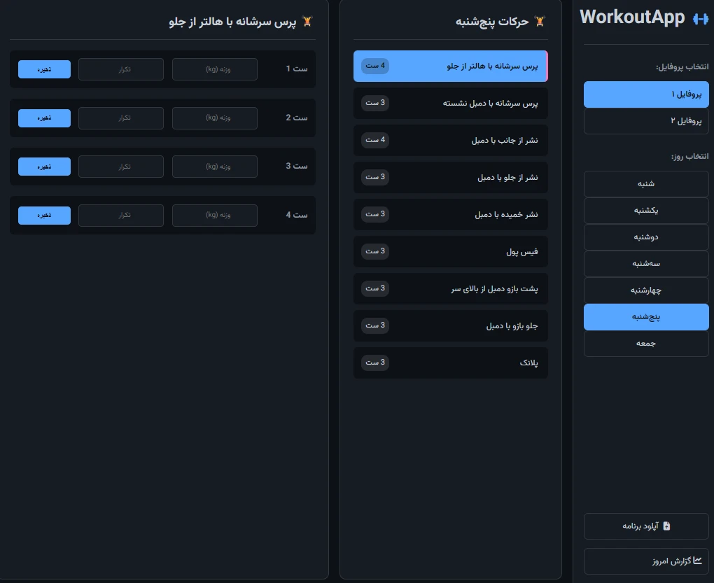 رهگیری تمرینات: ثبت دقیق وزن، تکرار و ستها به صورت بلادرنگ.