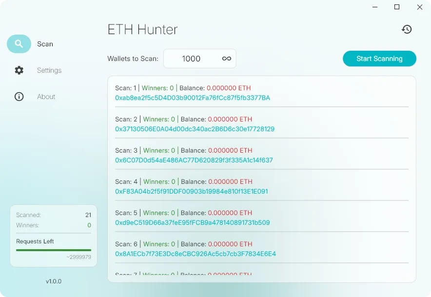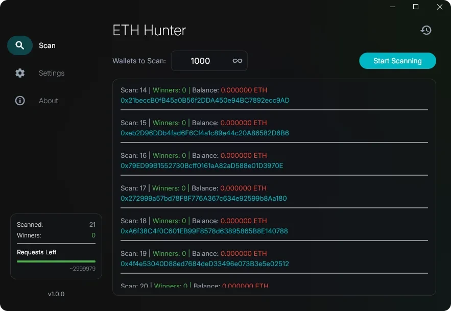 صفحه Scan لاگهای زنده، تعداد ولتهای پیدا شده و موجودی آنها را نمایش میدهد. ولتهای دارای موجودی هایلایت شده و با کلیک امکان مشاهده در Etherscan وجود دارد. کاربر میتواند تعداد ولتهای اسکن شده را تعیین کند یا با دکمه ∞ حداکثر درخواستها را استفاده کند.