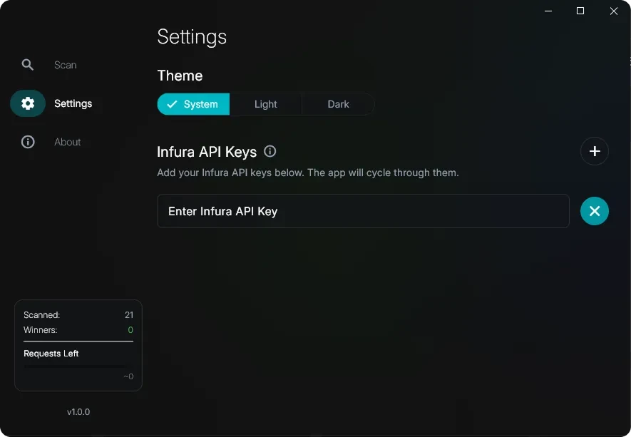 صفحه Settings مدیریت Theme و Infura API Key ها را ممکن میسازد. اپ به صورت خودکار بین کلیدها جابجا میشود و عملیات اسکن بدون وقفه ادامه مییابد.