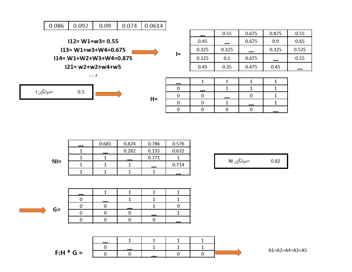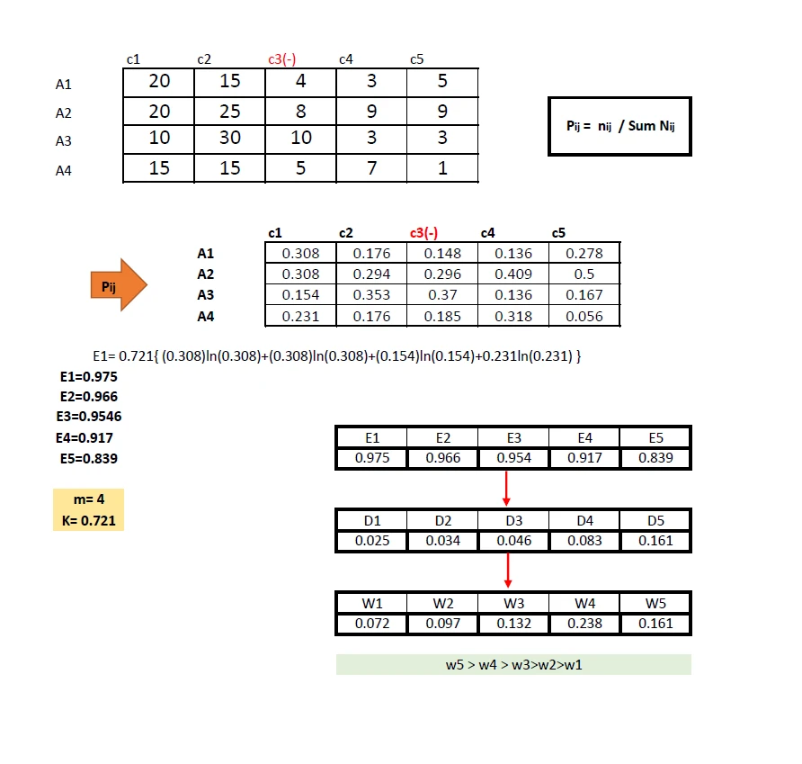 محاسبه اوزان شاخص ها با استفاده از روش آنتروپی شانون و سپس اولویت بندی گزینه های A1 الی A4 با شاخص های ۵ گانه C1 تا C2 ، با در نظر گرفتن اوزان حاصله، در ماتریس تصمیم گیری داده شده، به روش های الکتره ، تاپسیس ، ANP و ویکور