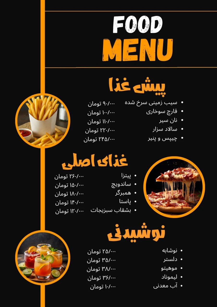 طراحی منوی غذایی با تمرکز بر سه بخش اصلی پیش غذا، غذای اصلی و نوشیدنی ها انجام شده. است هر بخش با تصویر مرتبط همراه شده. دلیل انتخاب رنگ پس زمینه، تمرکز بر روی آیتم ها بوده. رنگ های به کار رفته باعث شده تا منو برای مخاطب جذاب تر به نظر برسد. این منو قابلیت شخصی سازی دارد.