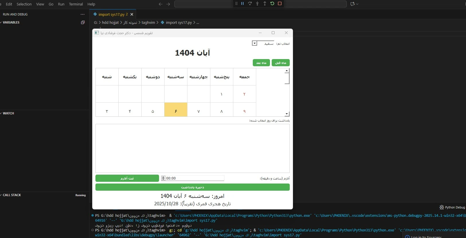 این تقویم به زبان پایتون نوشته شده است، می توانید یادداشت خود را به صورت آلارم یادآوری کنید.