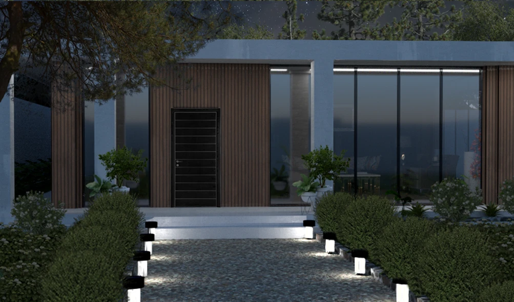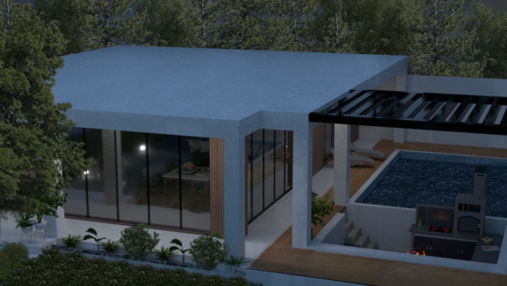 این ویلای خصوصی برای یک خانواده با دو فرزند و یک سگ طراحی شده است، یک ویلا با دو اتاق خواب مجزا و یک اتاق مستر و با نمای پنجره های سراسری.پروژه شامل استخر روباز و فضای باربیکیو فرو رفته در کنار آن است، که فضایی دنج، صمیمی و اجتماعی در محیط بیرونی ایجاد میکند