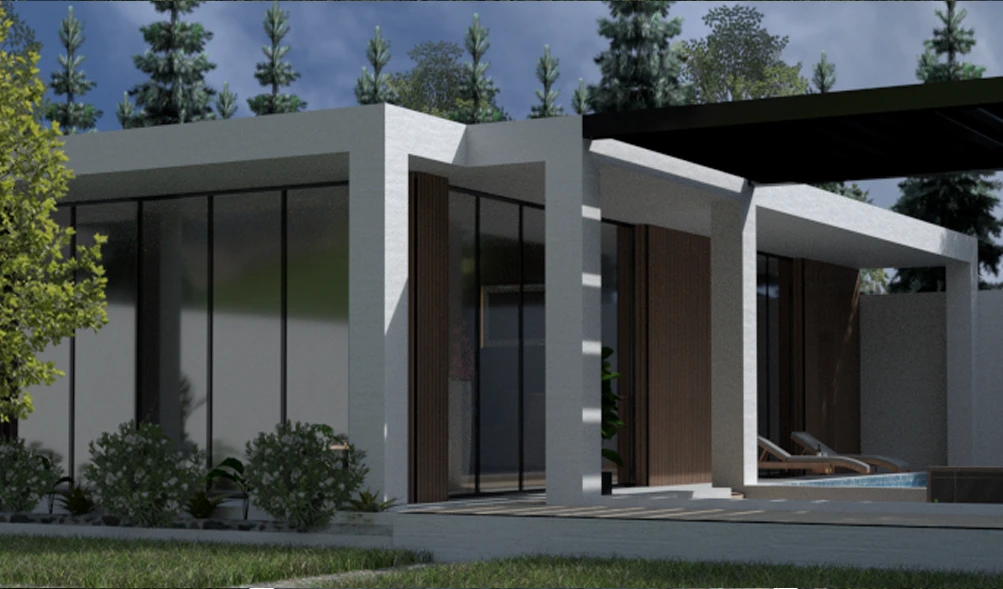 معماری ویلا با رویکردی مدرن و مینیمال طراحی شده و از مواد طبیعی مانند بتن سفید، چوب و سنگ بهره میبرد تا تعادلی میان سادگی، گرما و عملکرد کاربردی فضا ایجاد شود