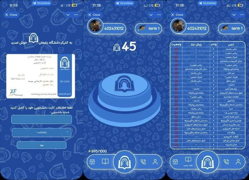 چون بنده دانشجوی دانشگاه دامغان بودم یک مینی اپ مانند notcoin ساختم برای جلب توجه اساتید و دانشجویان تا بیشتر دیده شم و از اون پروژه پروژه ایی به دست بگیرم و استارت کارم رو شروع کنم. کارکرد مینی اپ به این گونه است که با کلیک کردن سکه میگیرند و طبق ترم جاری محدودیت کلیک دارن با شارژ خودکار و میتونن با سکه دروس خریداری کنن طبق پیش نیاز ها و با شانس موفقیت دروس انها را پاس کنند و تا فارق التحصیلی بروند. در حال حاضر پروژه روی هیچ سروری ران نیست متاسفانه برای تست چون توی دانشگاه به جایی نرسید.