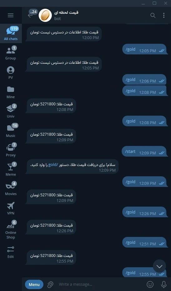 در این پروژه قیمت لحظه ای طلا و دلار رو به ما میداد و متاسفانه با نبود api رایگان مجبور بودم با کتابخانه selenium از یکی دو وب سایت معروف خرید طلا قیمت رو بگیرم و میانگین رو به صورت لحظه ای با دیلی پایین در دست ربات قرار بدم و کاربر میتونست اینو اد کنه به چنلش و راحت هی قیمت رو از ربات ما بگیره یا شخصی به داخل ربات برن و با زدن تنها /gold قیمت طلا رو بگیرند.