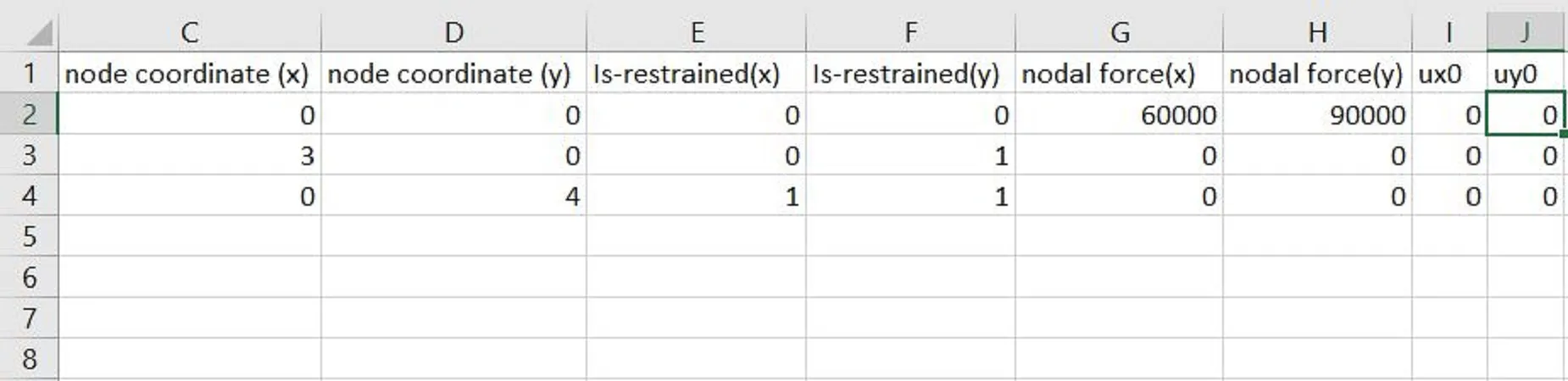 مساله تعریف شده حل المان محدود یک خرپای دو بعدی در حالت کلی است. اطلاعات مسله شامل المان ها و گره ها از یک فایل اکسل خوانده می شود و نتایج برای حالت کلی ارایه می گردد.
