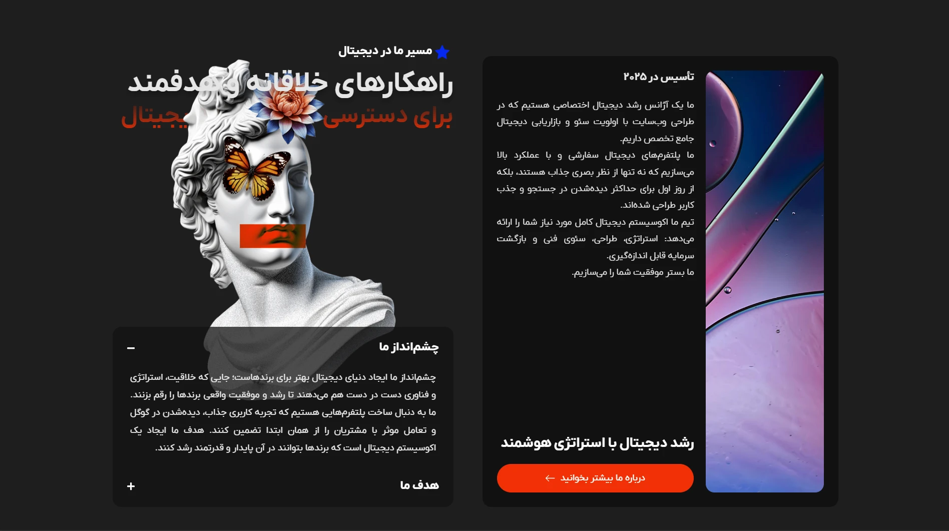 سایت بهصورت کاملاً ریسپانسیو طراحی شده و ساختار آن بهگونهای پیادهسازی شده است که معرفی خدمات دیجیتال مارکتینگ، نمونهکارها و راههای ارتباطی به شکلی شفاف و حرفهای در دسترس کاربران قرار گیرد.