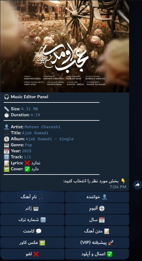 طراحی و توسعه ربات تلگرام ویرایش موزیک با پنل مدیریت پیشرفته