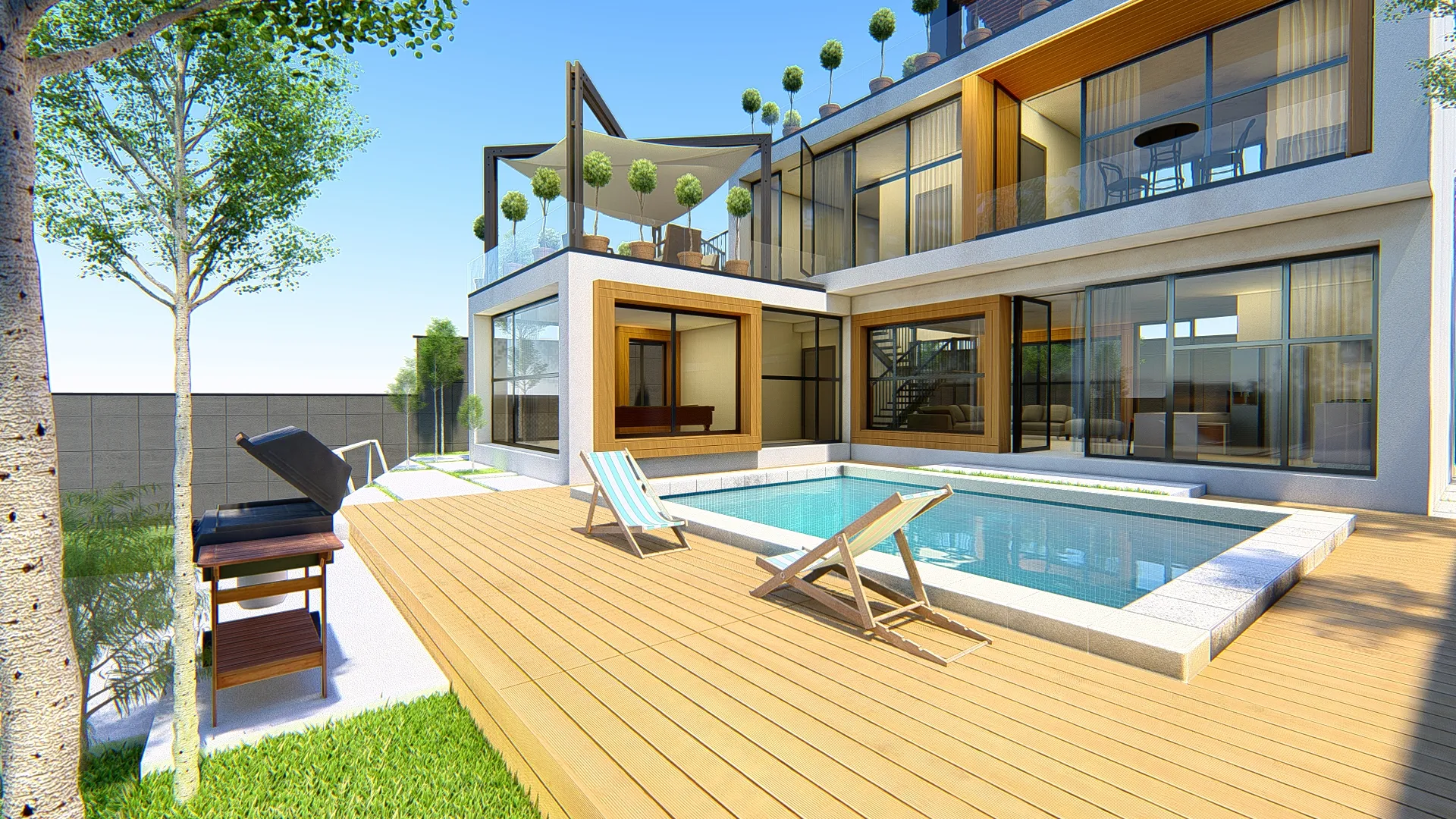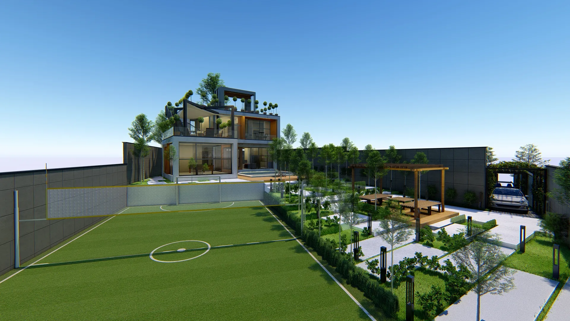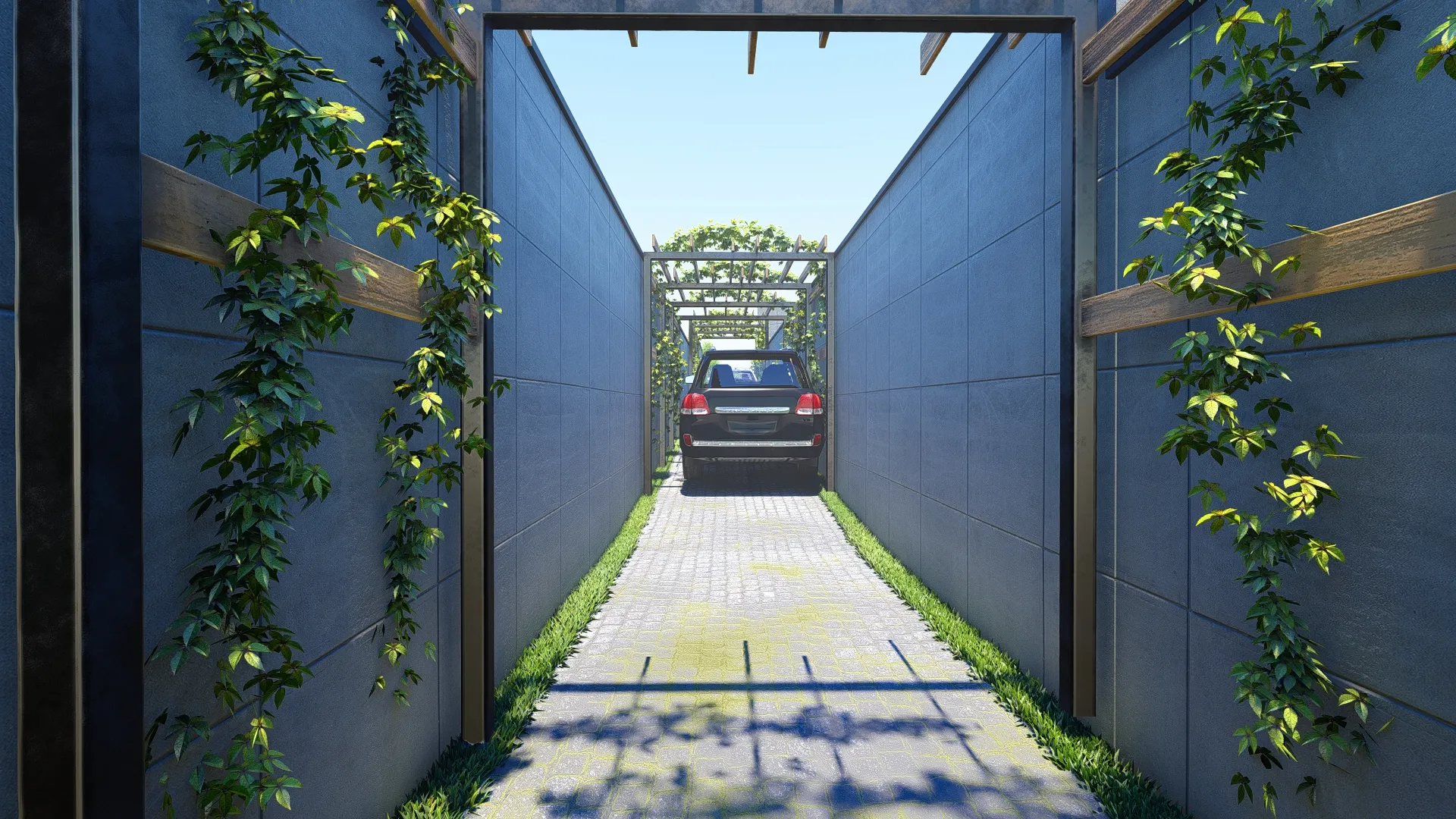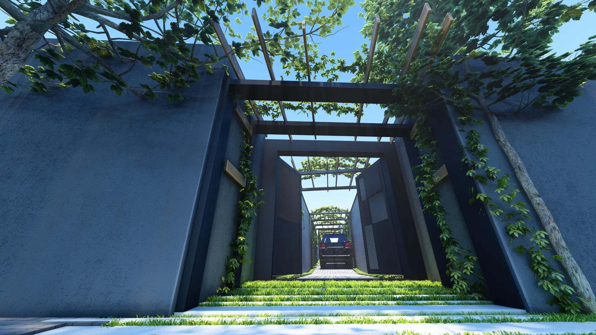 آلترناتیو 2 شامل: طراحی حجم و نمای ویلا و طراحی منظر و طراحی سر در و پارکینگ ورودی