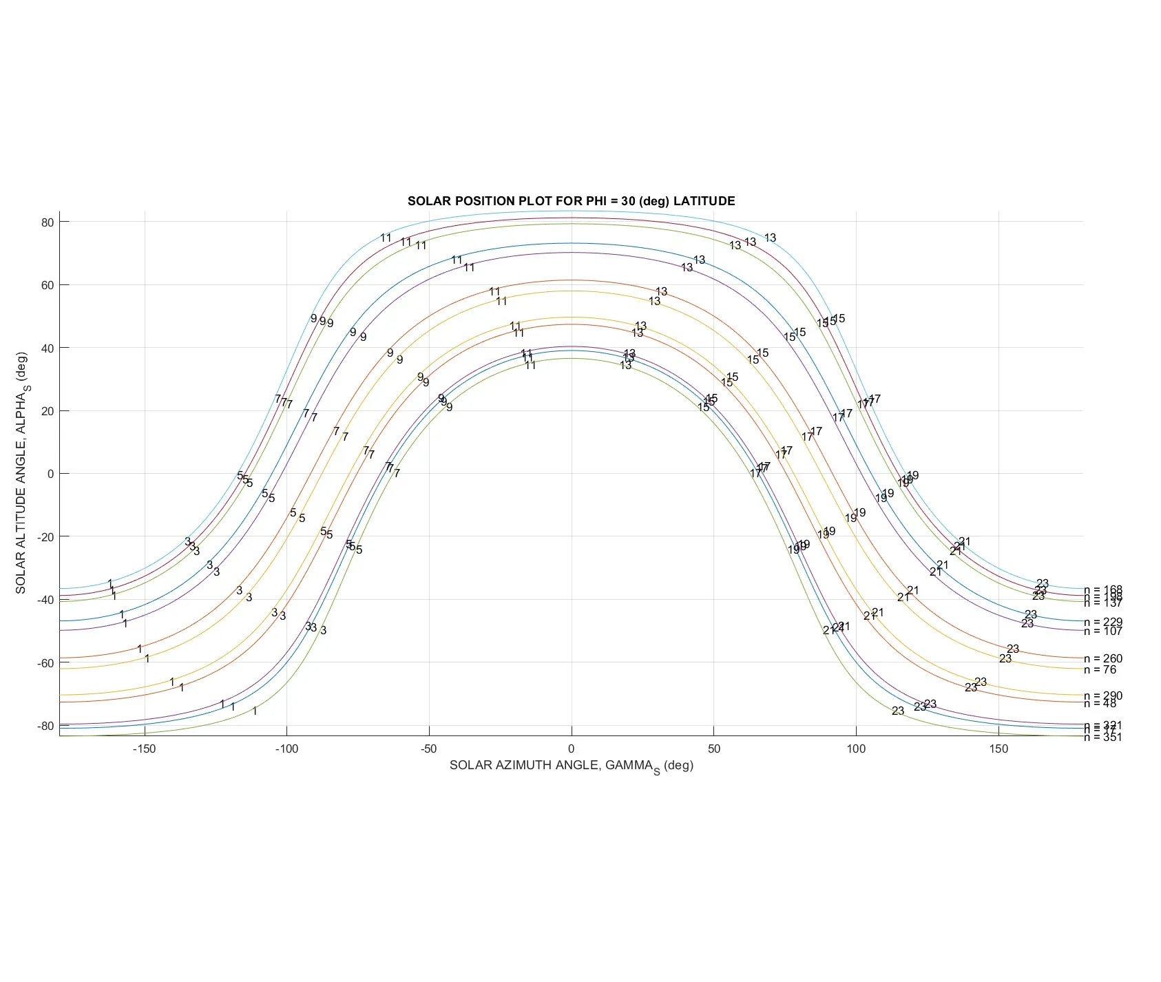 نمودار تعیین ساعت خورشیدی برای عرضهای جغرافیایی مختلف در روزهای مختلف سال رسم شده است.